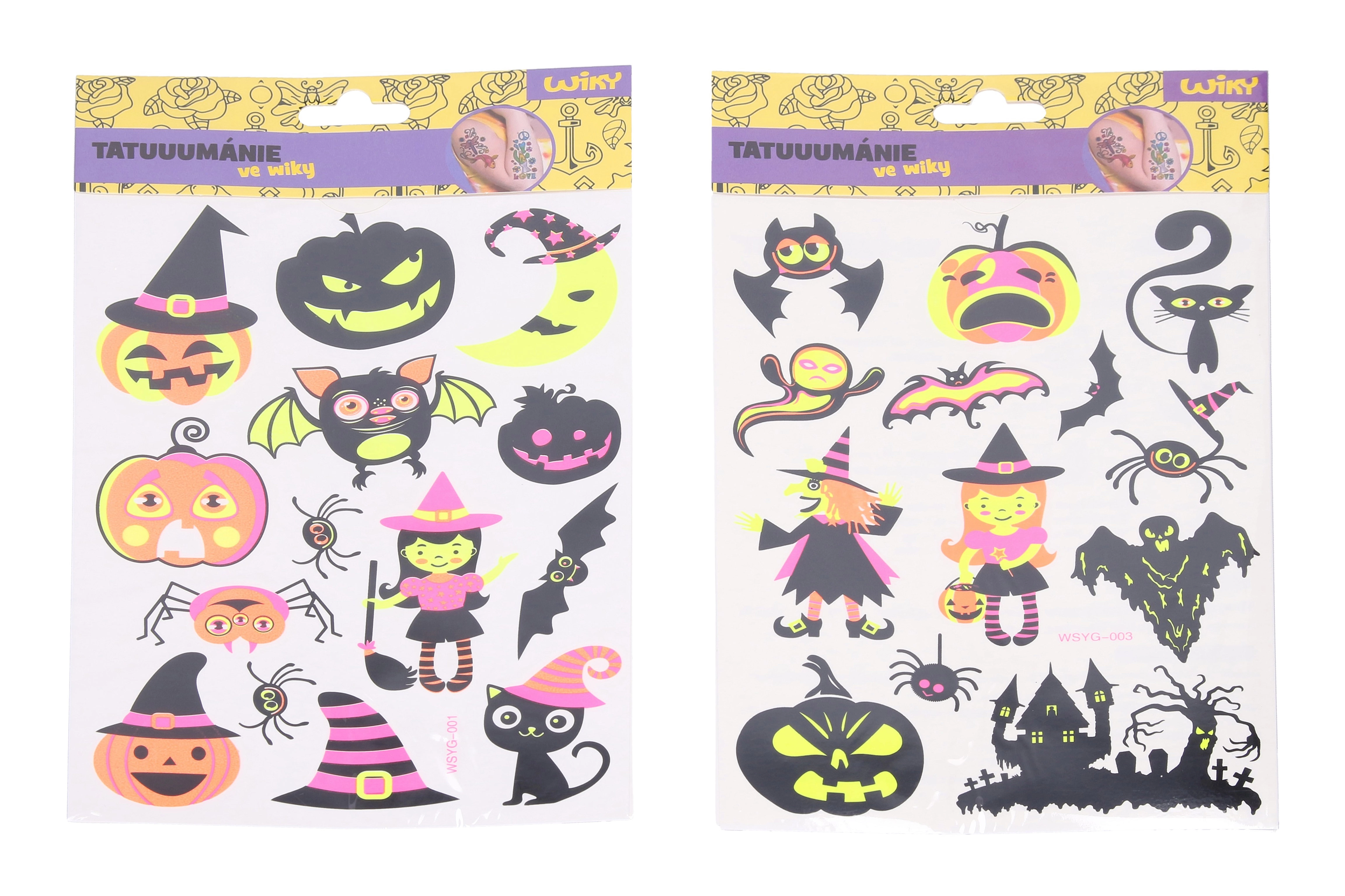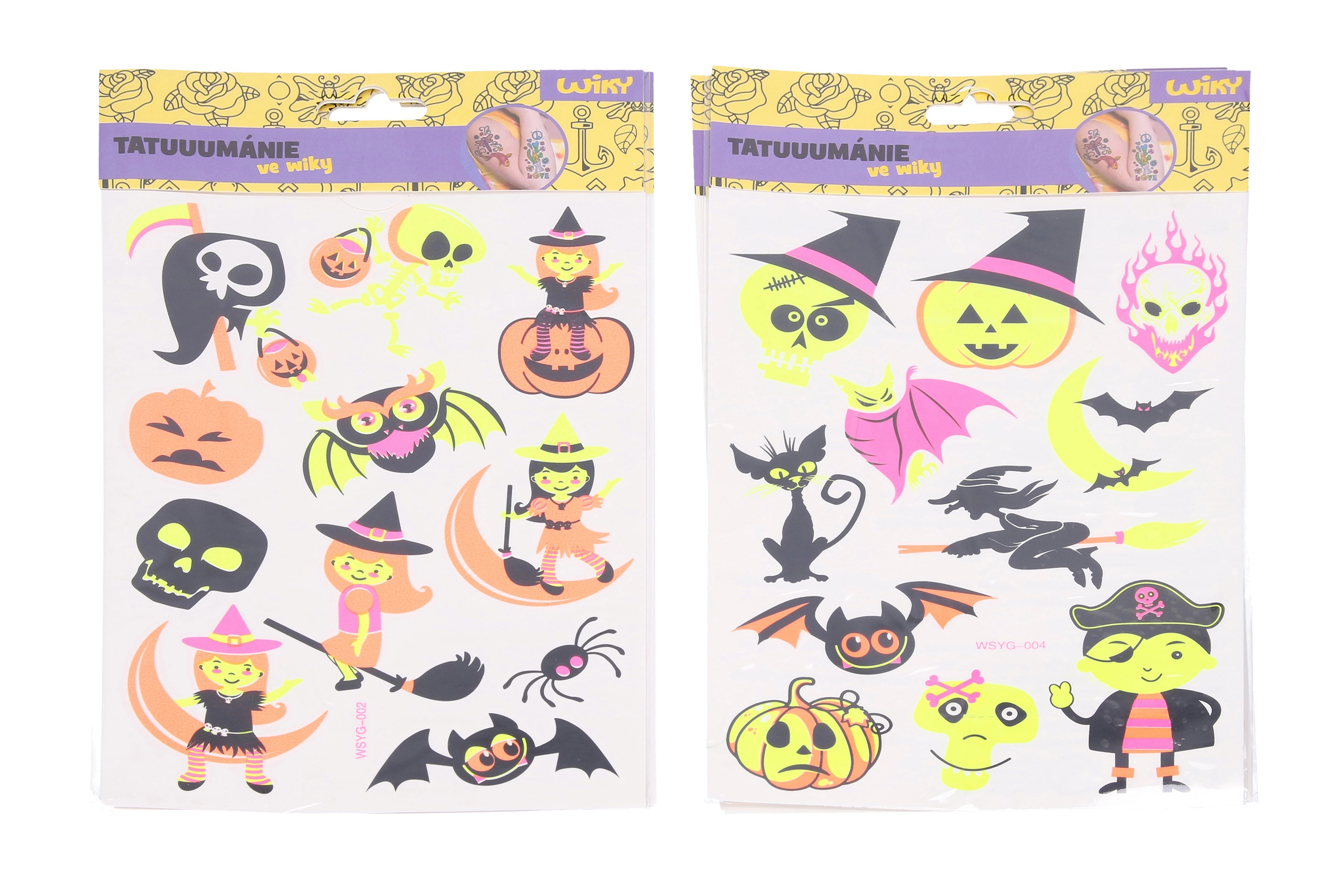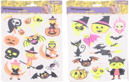 Descoperiți tatuajele temporare fluorescente cu motive de Halloween, care strălucesc sub lumină UV. Ideale pentru petreceri, carnavaluri și evenimente tematice, se aplică ușor și se îndepărtează la fel de simplu. Dimensiunea foii 16,5 × 22 cm, disponibile în 4 variante de motive.