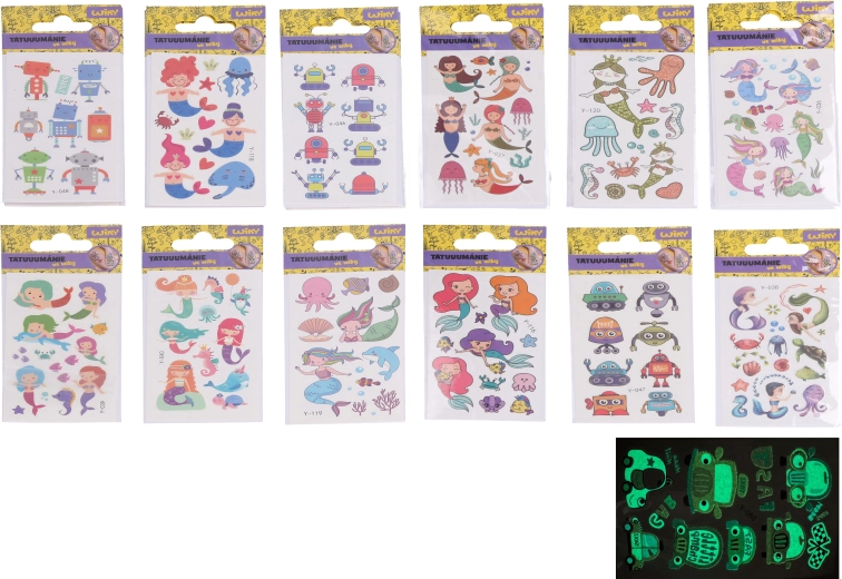 Tatuaje temporare care strălucesc! Aceste stickere pentru tatuaje oferă un mix colorat de motive și, după expunere la lumină, strălucesc în întuneric, fiind perfecte pentru petreceri, festivaluri și costume. Sunt delicate cu pielea și se aplică ușor cu apă.