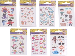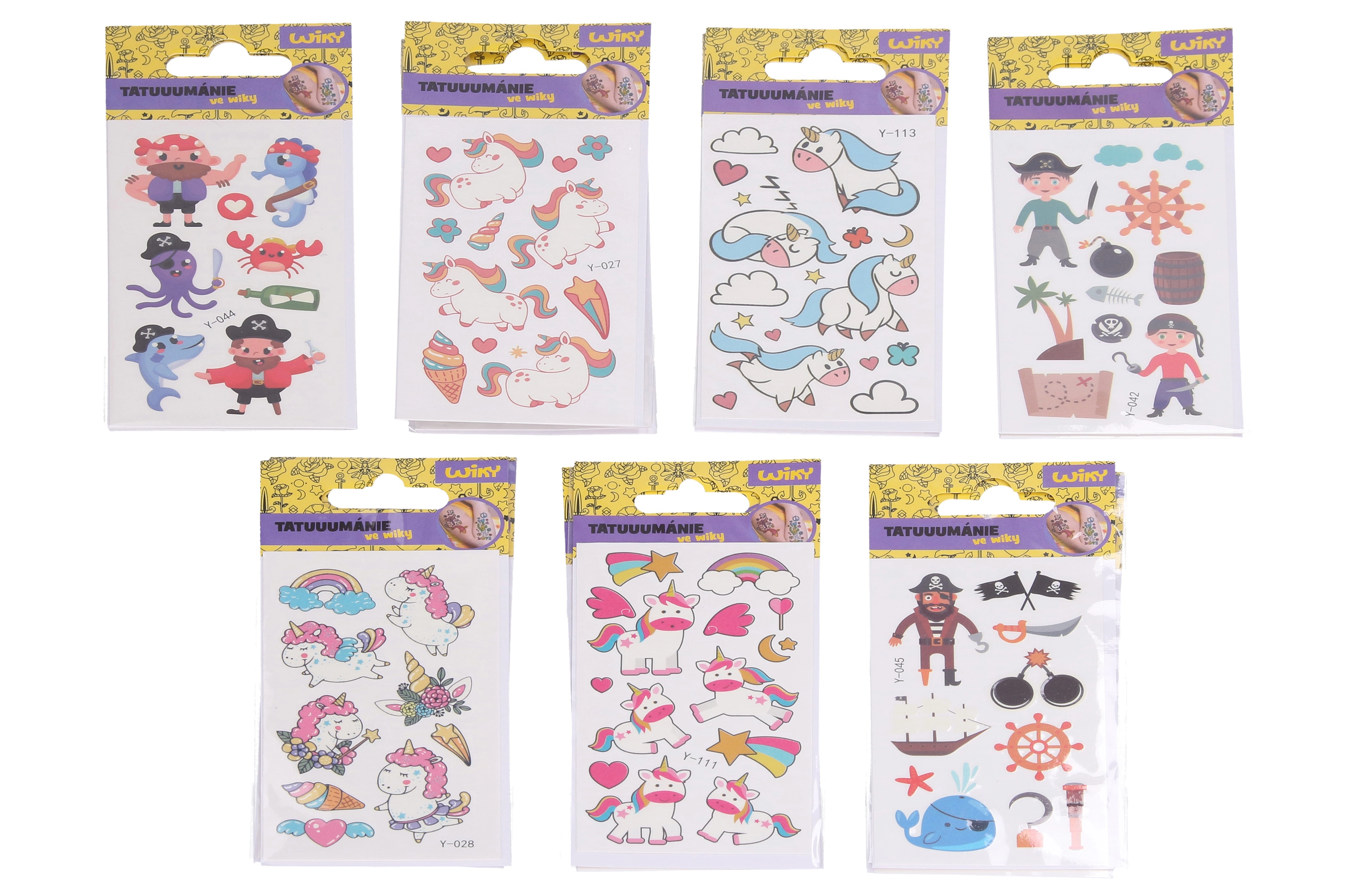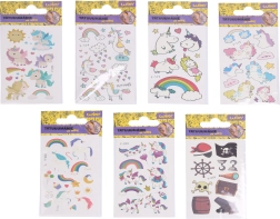 Tatuaje temporare amuzante pentru copii, care strălucesc în întuneric, îi vor bucura pe micii iubitori ai fanteziei și aventurii. Formatul practic de 6 × 10,5 cm și marele mix de motive cu unicorni și pirați sunt potrivite pentru petreceri, cadouri și joaca de zi cu zi.