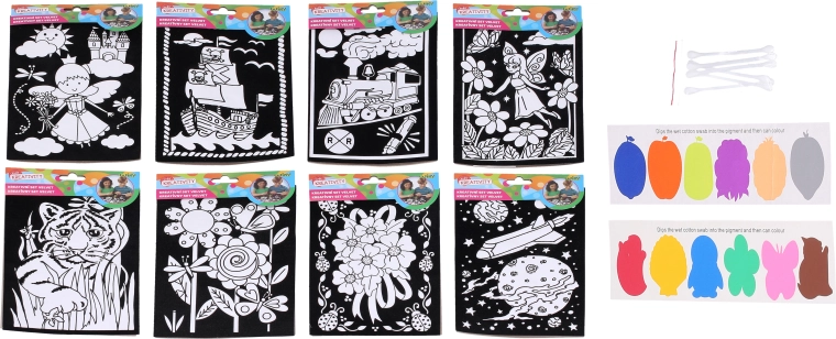 Descoperă un set creativ catifelat de 15,5 × 25 cm cu culori și 6 bețișoare pentru creații ușoare. Ideal pentru copii și începători – suprafața catifelată facilitează colorarea, culorile nu depășesc conturul, iar rezultatul arată profesionist.