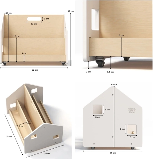 Bibliotecă practică pentru copii, pe roți, cu acces pe ambele părți, îi ajută pe cei mici să vadă coperțile cărților și să aleagă singuri. Datorită marginilor rotunjite fin și construcției stabile din placaj de mesteacăn, este sigură, mobilă și prietenoasă cu copiii. Fabricată în Cehia, din placaj de mesteacăn lăcuit de înaltă calitate și cu lacuri pe bază de apă pentru siguranță maximă.