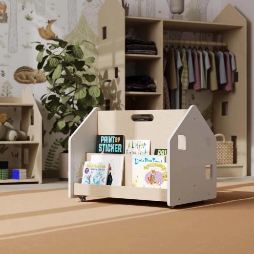 Cărțile sunt expuse cu fața, astfel încât copiii văd imediat coperțile și pot alege singuri. Încurajează obiceiurile de lectură și o organizare clară.