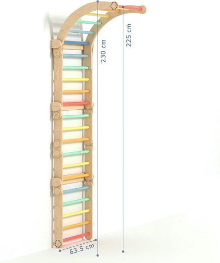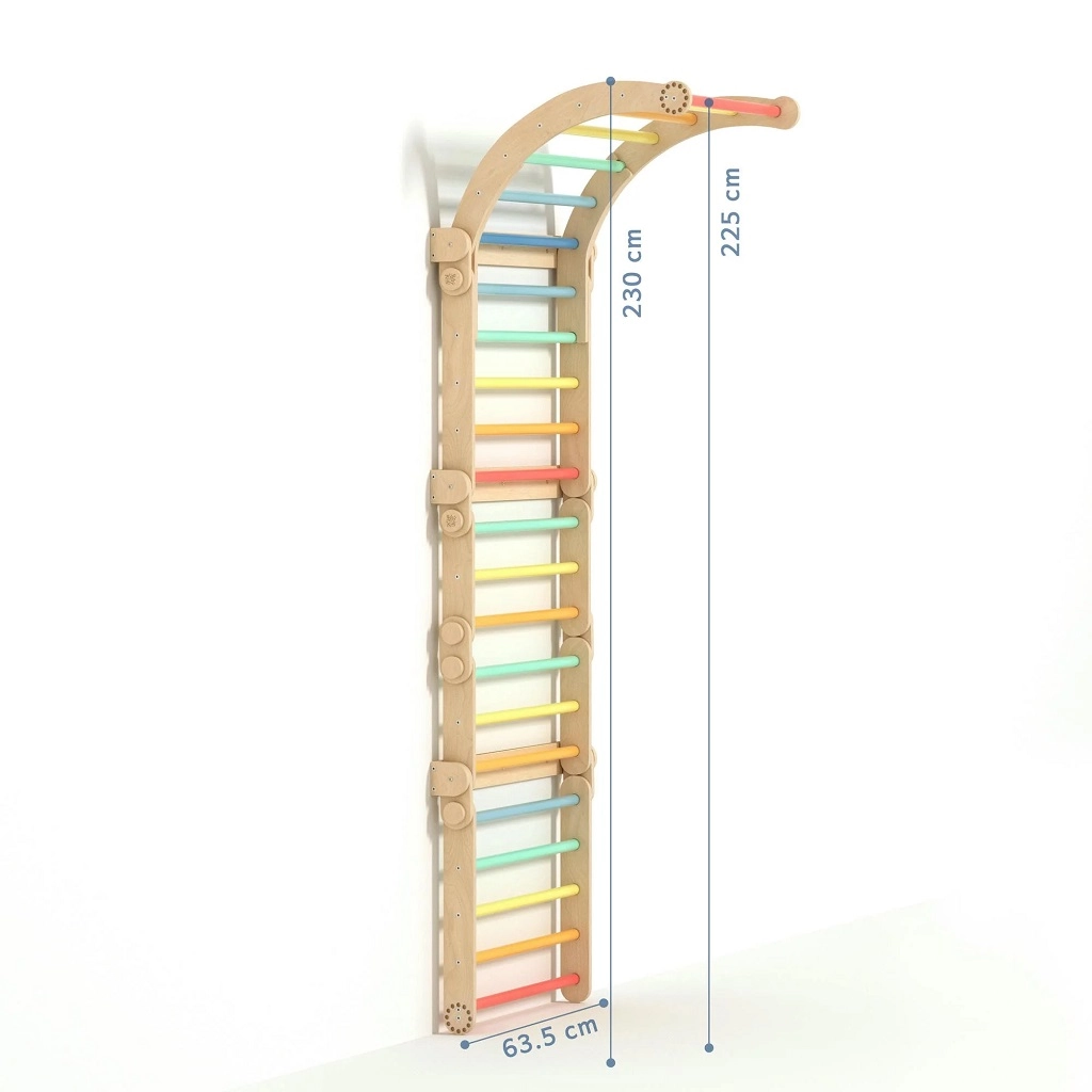 Spalierele de interior BUSYKIDS cu bară în versiune curcubeu îmbină designul inteligent, materialele de calitate și posibilități vaste de joacă. Setul format din două triunghiuri și un arc de echilibru poate fi folosit pe podea pentru târâre și primele urcări sau, cu ajutorul unui sistem special de prindere pe perete, se transformă într-un adevărat perete de escaladă. Barele colorate invită la joacă și antrenează coordonarea, forța și echilibrul.