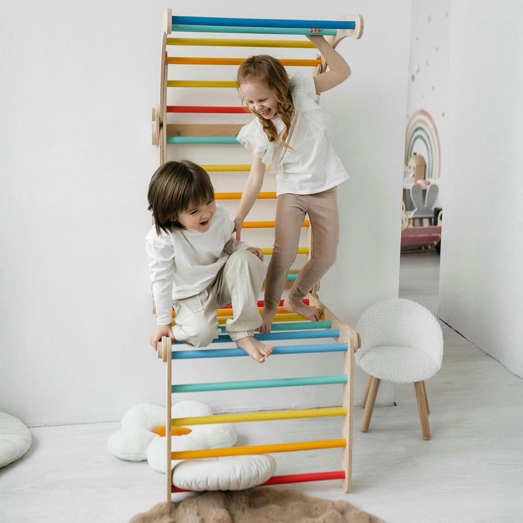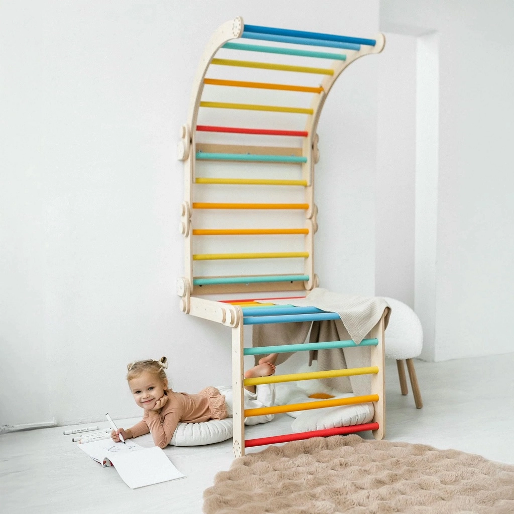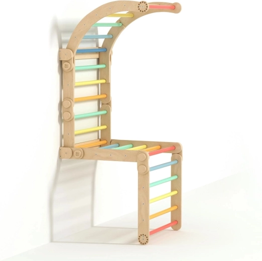 Barra și barele în culorile curcubeului motivează la atârnări și cățărare, iar muchiile netede și cadrul stabil asigură siguranța la fiecare activitate.