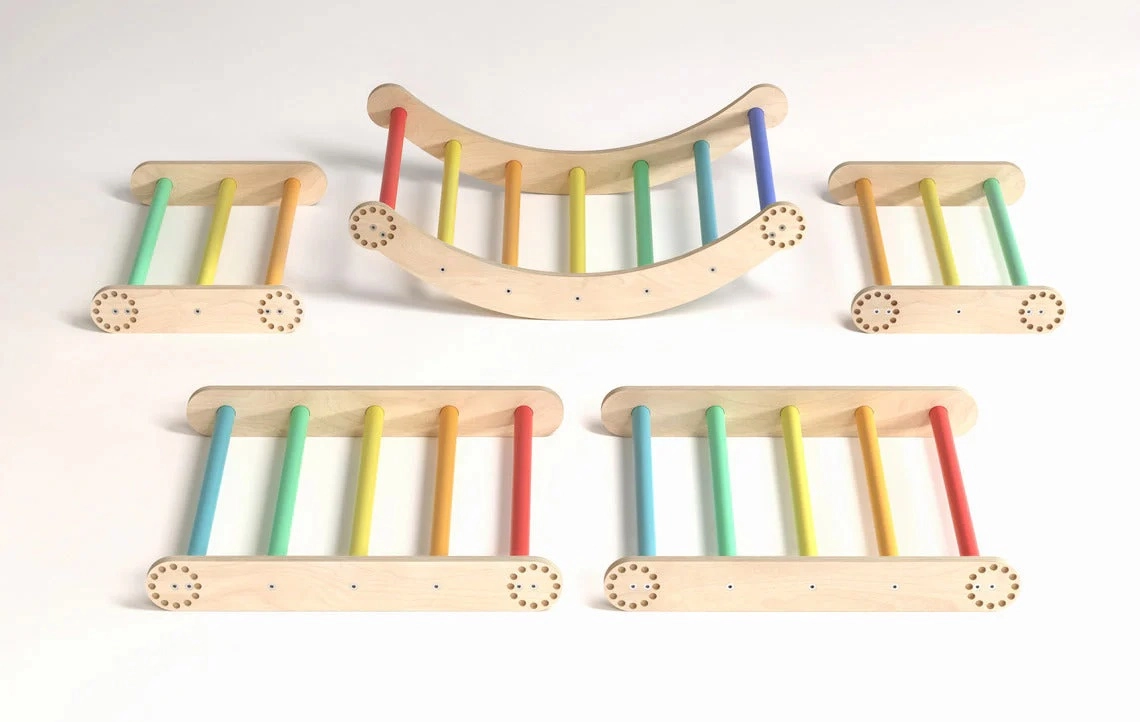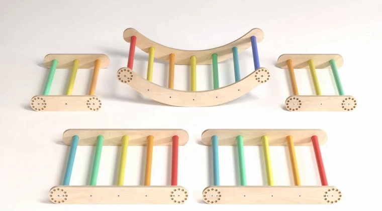 Două triunghiuri și un arc de echilibru se transformă ușor dintr-o pistă la sol într-un perete de cățărare cu montare pe perete. Ideal pentru dezvoltarea motricității și a echilibrului.