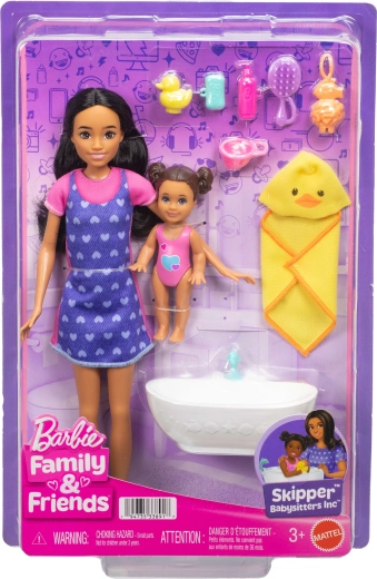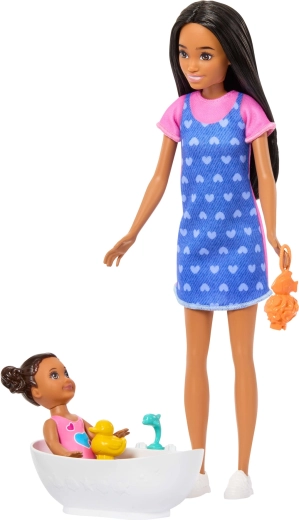 Setul BARBIE Skipper Baia bebelușului aduce un joc autentic de îngrijire a celor mici. Sora mai mare Skipper poartă o rochie cu șorț albastru cu inimioare și teniși comozi, iar bebelușul se bucură de baie în cădiță cu accesorii drăgălașe. Copiii pot recrea iar și iar ritualuri de baie cu rățușcă, prosop cu glugă și „cosmetice”.