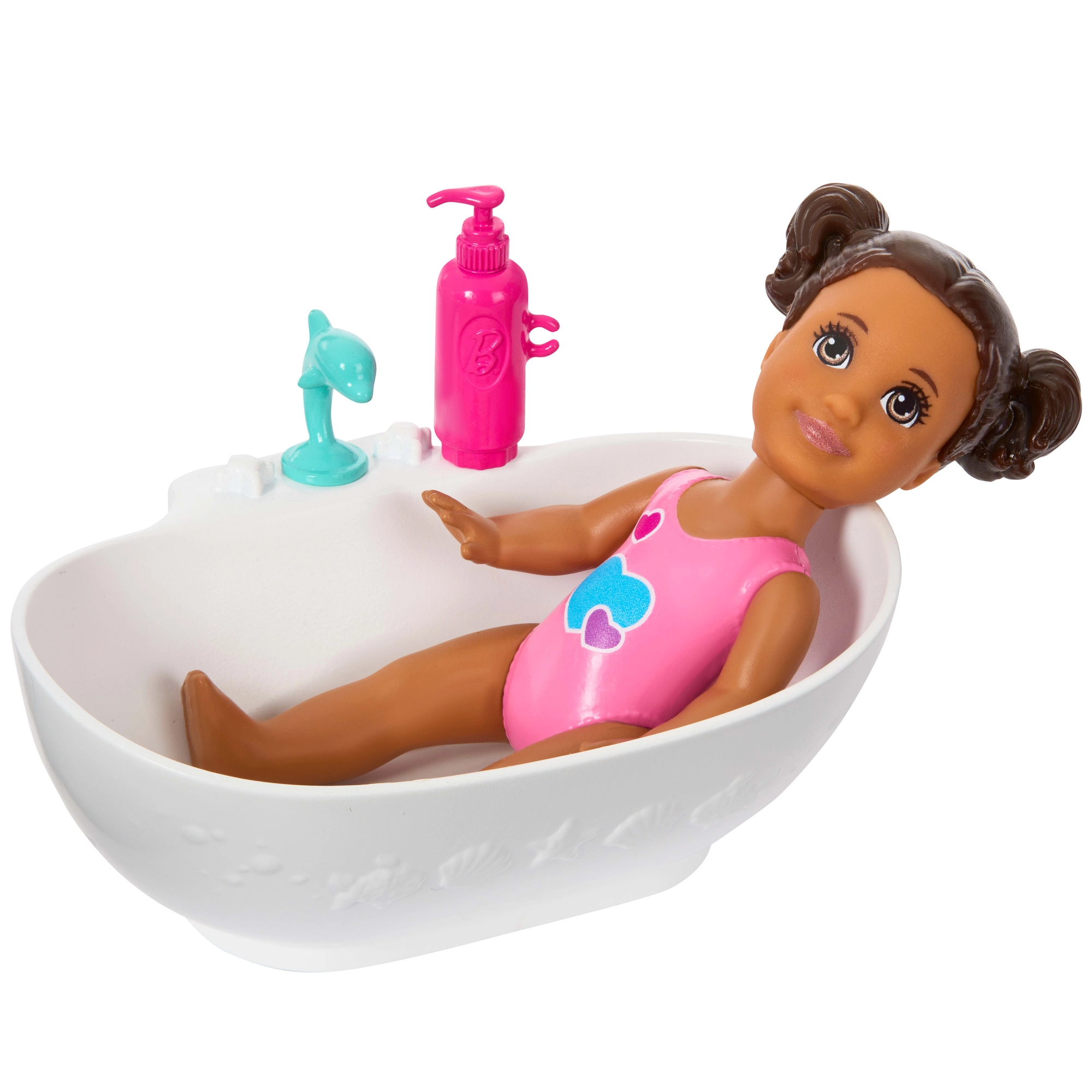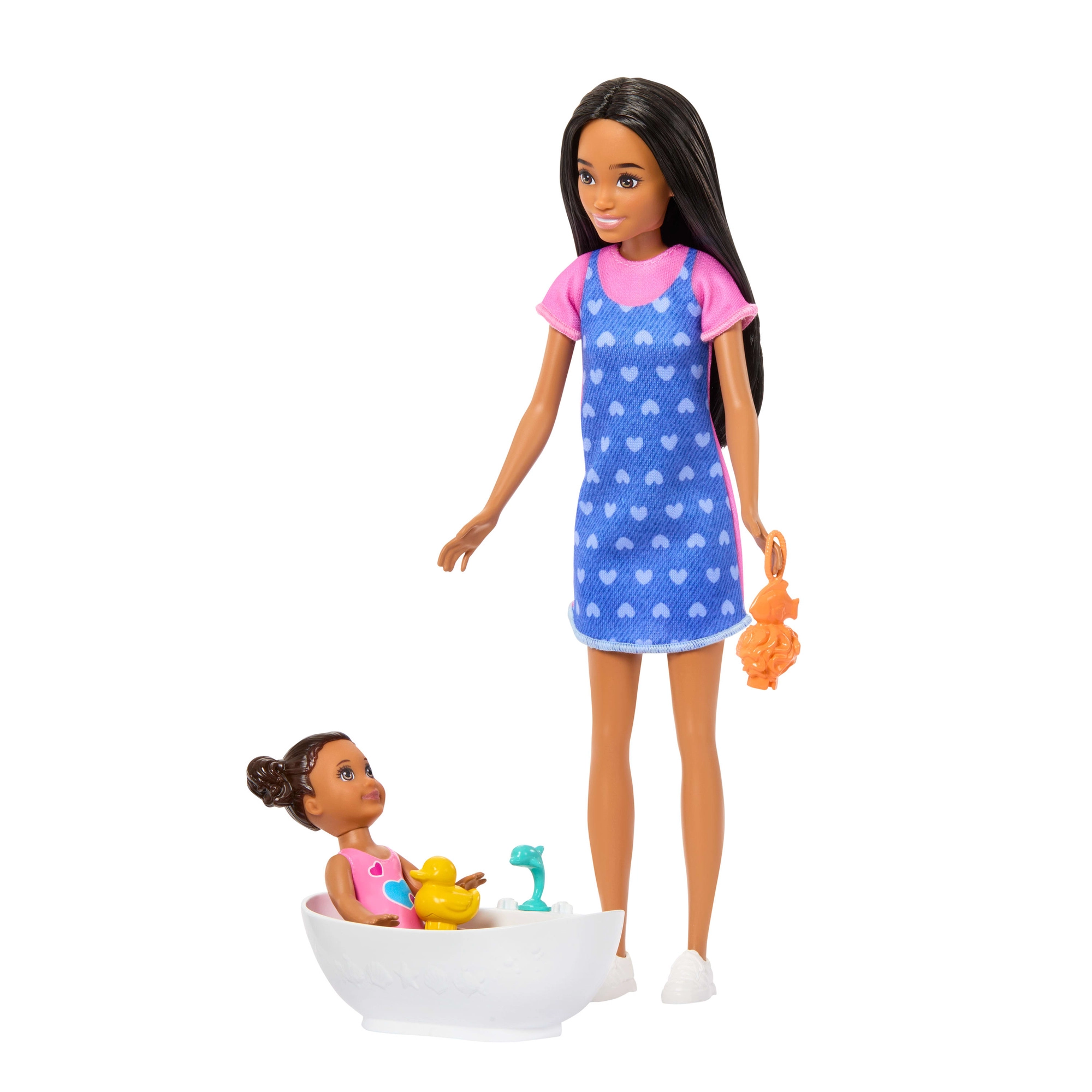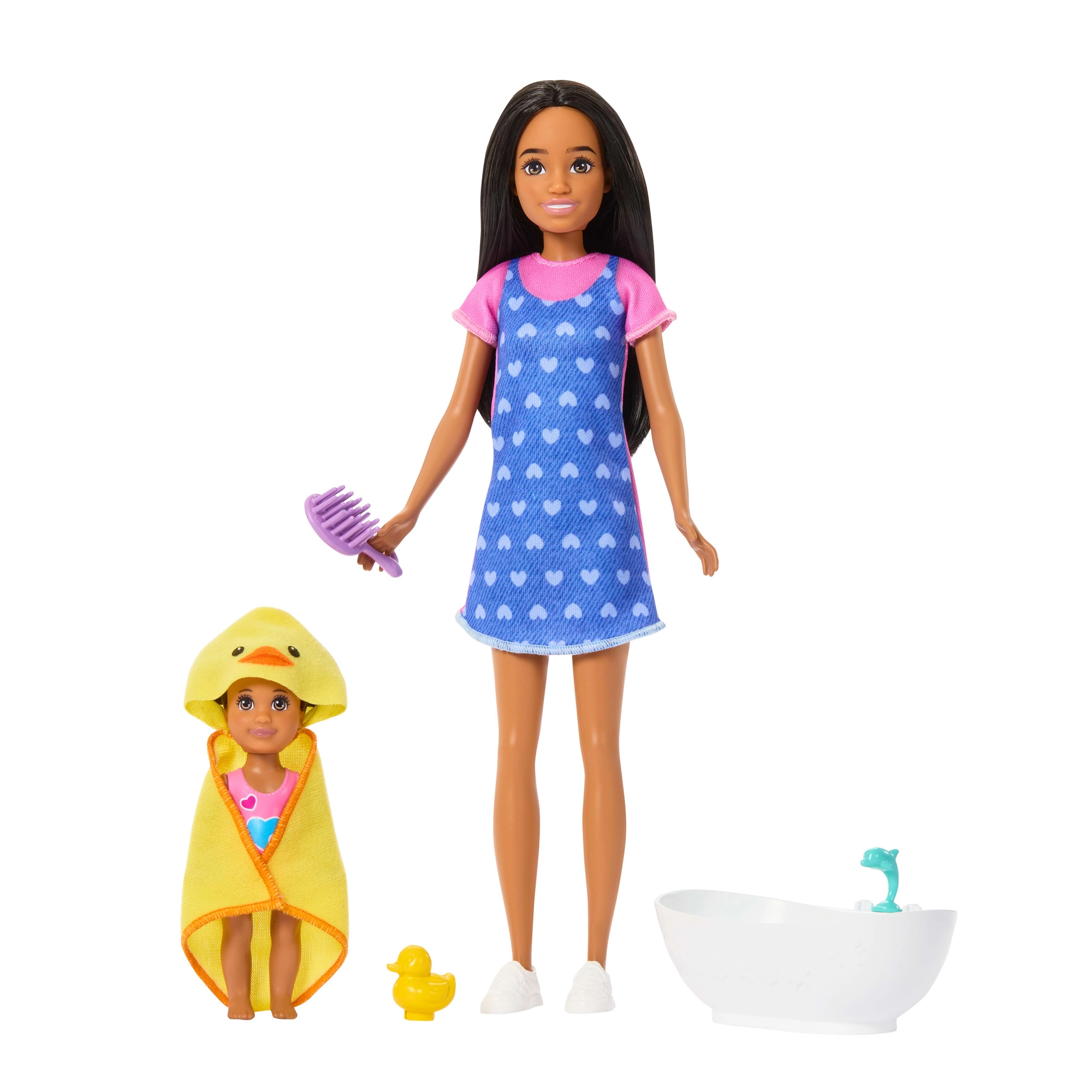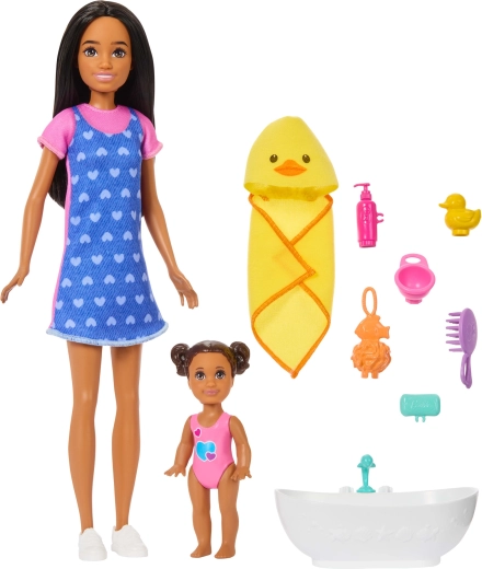 - Păpușa Skipper în rochie și teniși, păpușă-bebeluș, cădiță, prosop cu glugă, rățușcă, „șampon”, bol, „săpun”, burețel/burete de spălat, perie