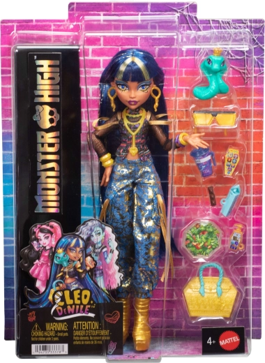 Intrați în lumea MONSTER HIGH cu iconica Cleo De Nile, care strălucește într-un stil egiptean modern. Topul scurt legat la gât, mânecile din plasă și pantalonii cargo albaștri cu accente aurii îi subliniază originea regală. În pachet se află și cobra credincioasă Sykfia, care completează perfect orice scenetă stilat-de înfricoșătoare.