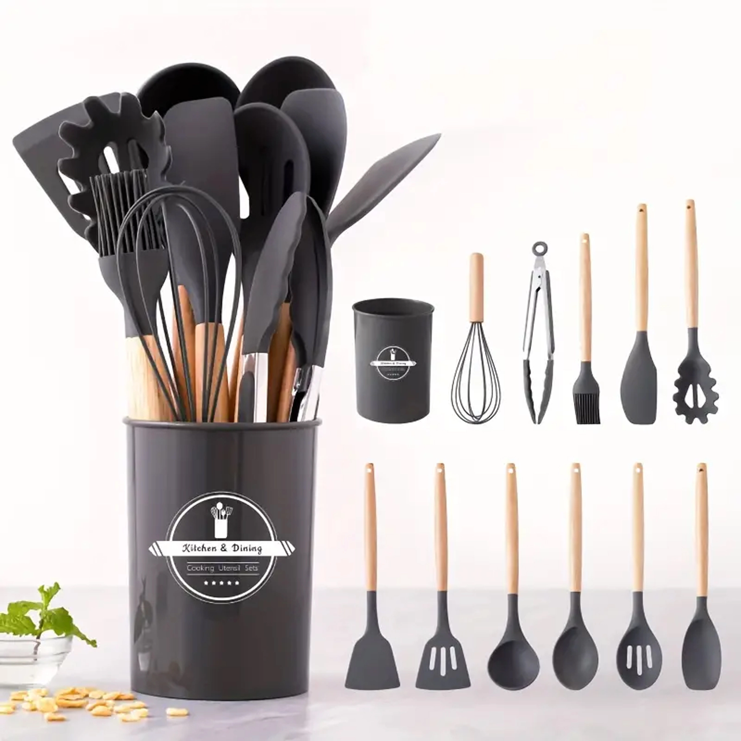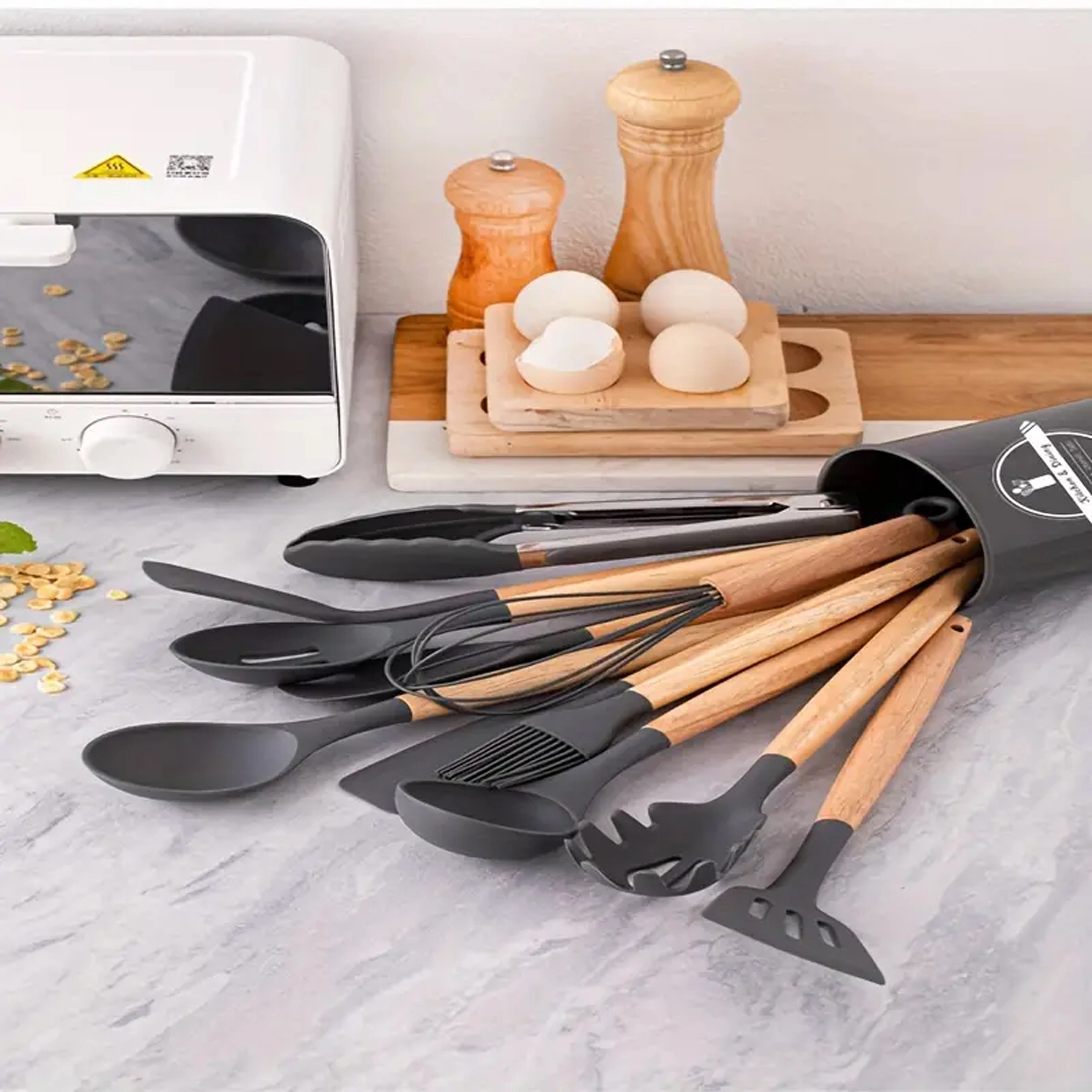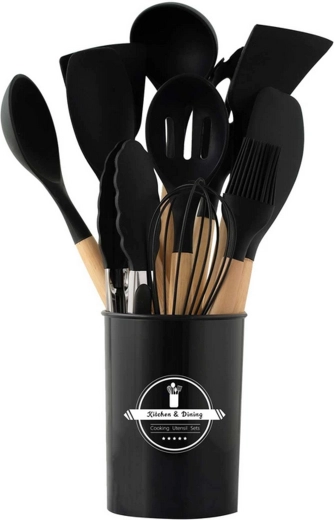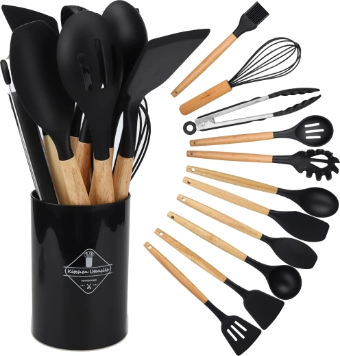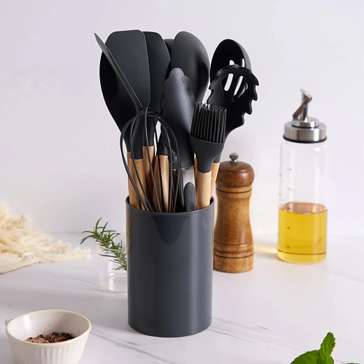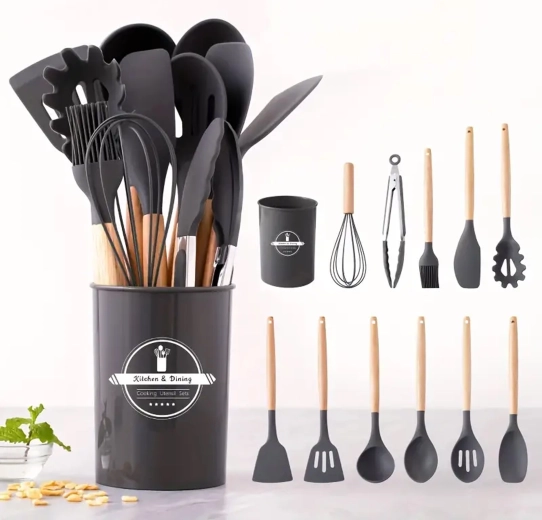 Setul include spatule, linguri, polonic, tel, clește, pensulă, ustensilă pentru servit paste și altele – toate depozitate în suport pentru acces rapid.