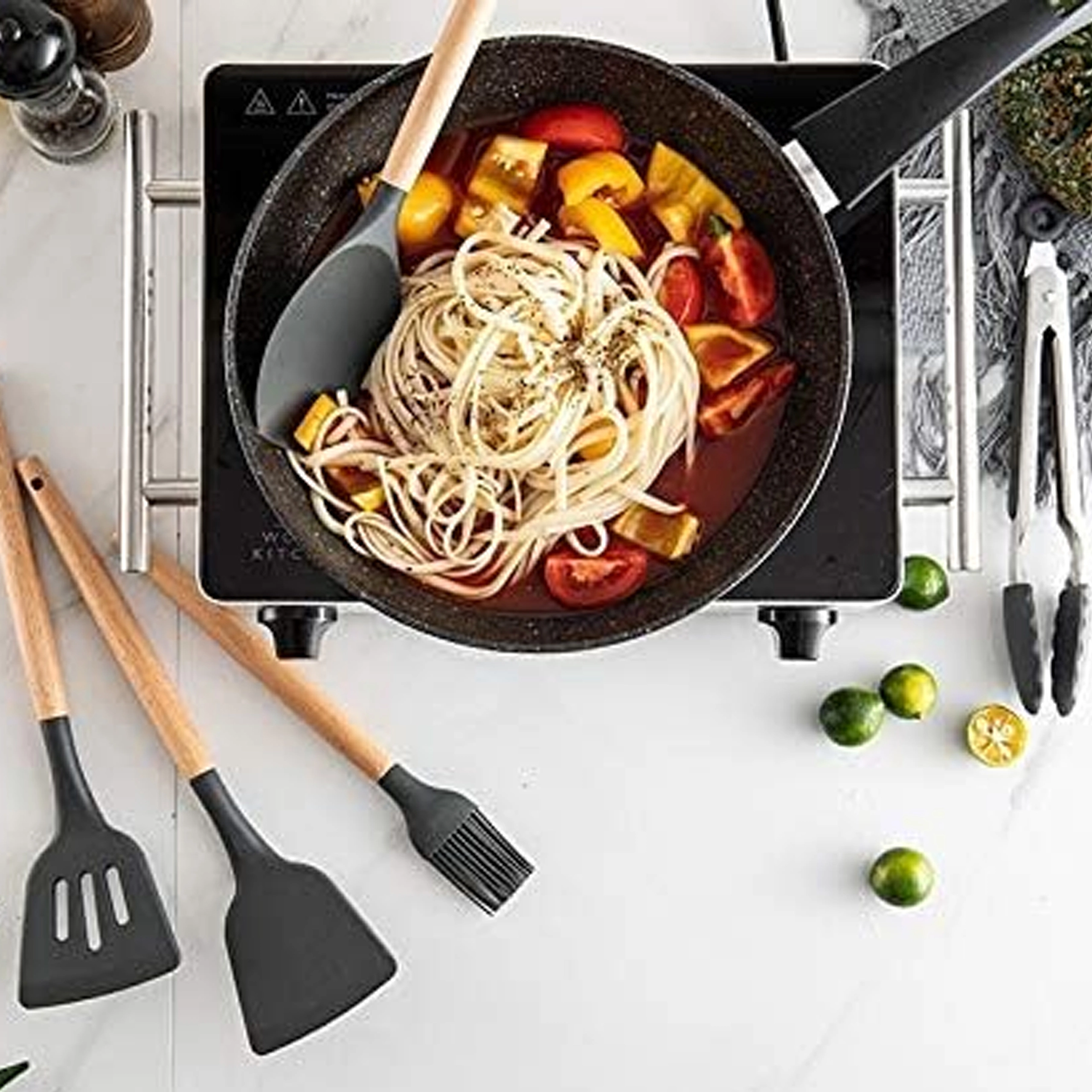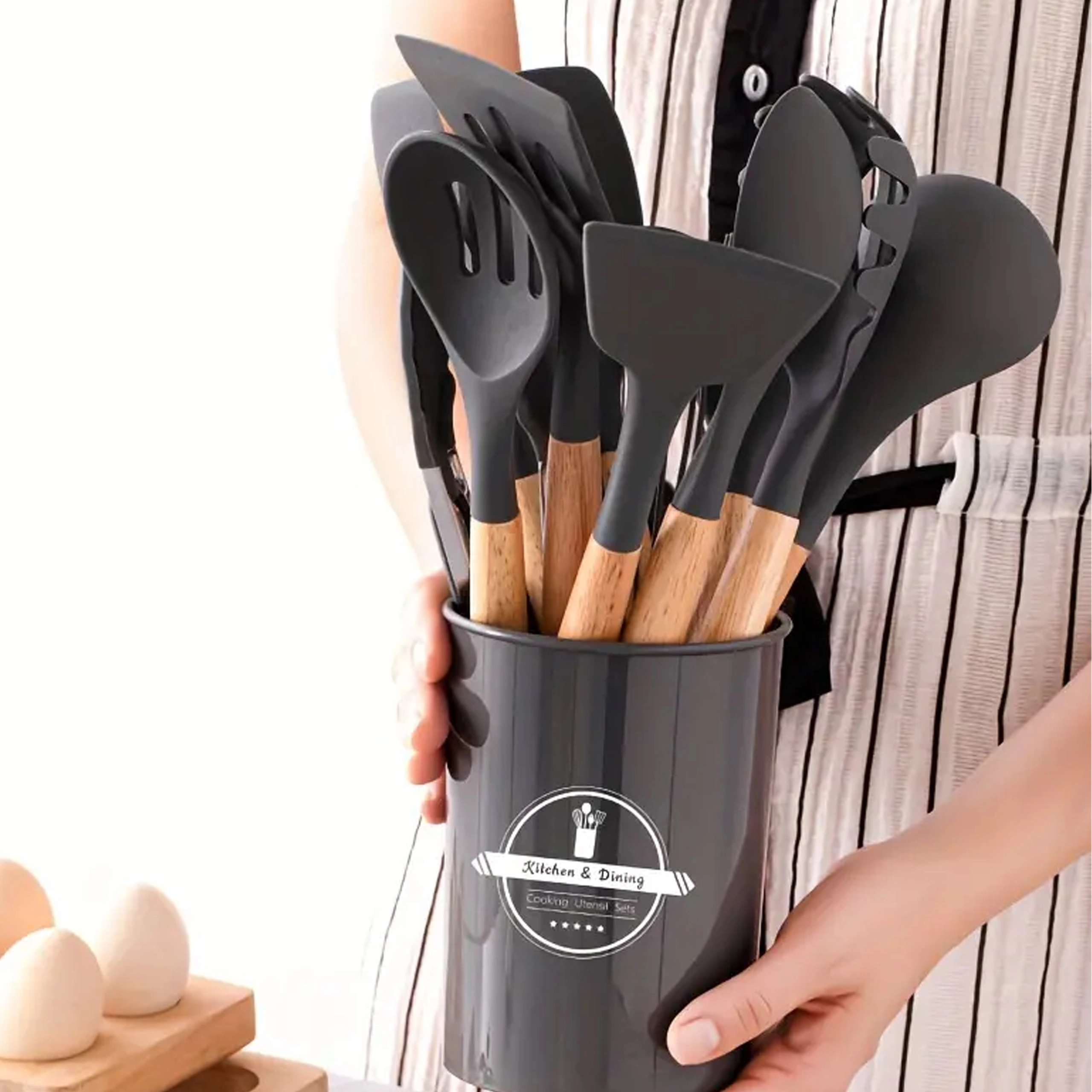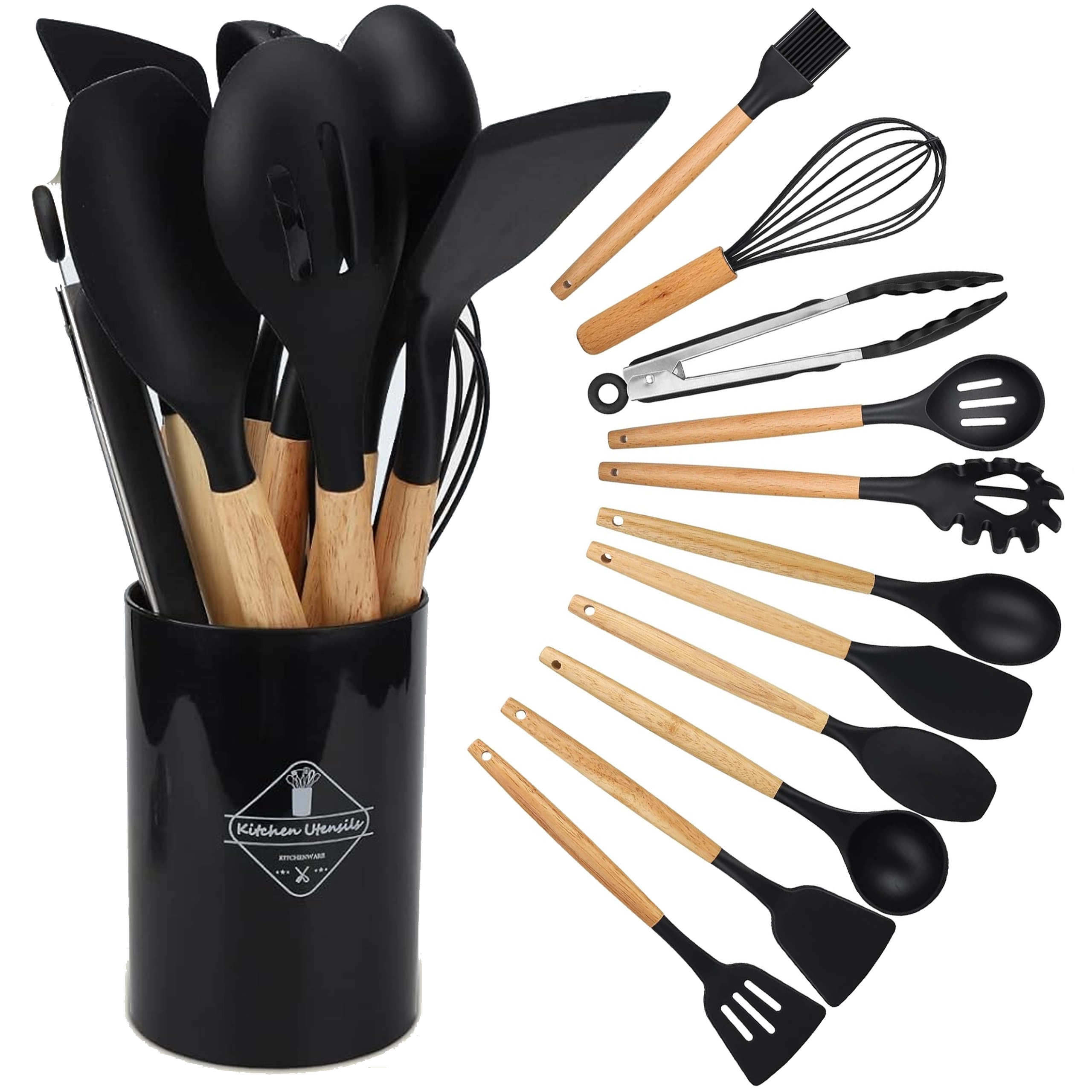 Setul include spatule, linguri, polonic, tel, clește, pensulă, ustensilă pentru servit paste și altele – toate depozitate în suport pentru acces rapid.