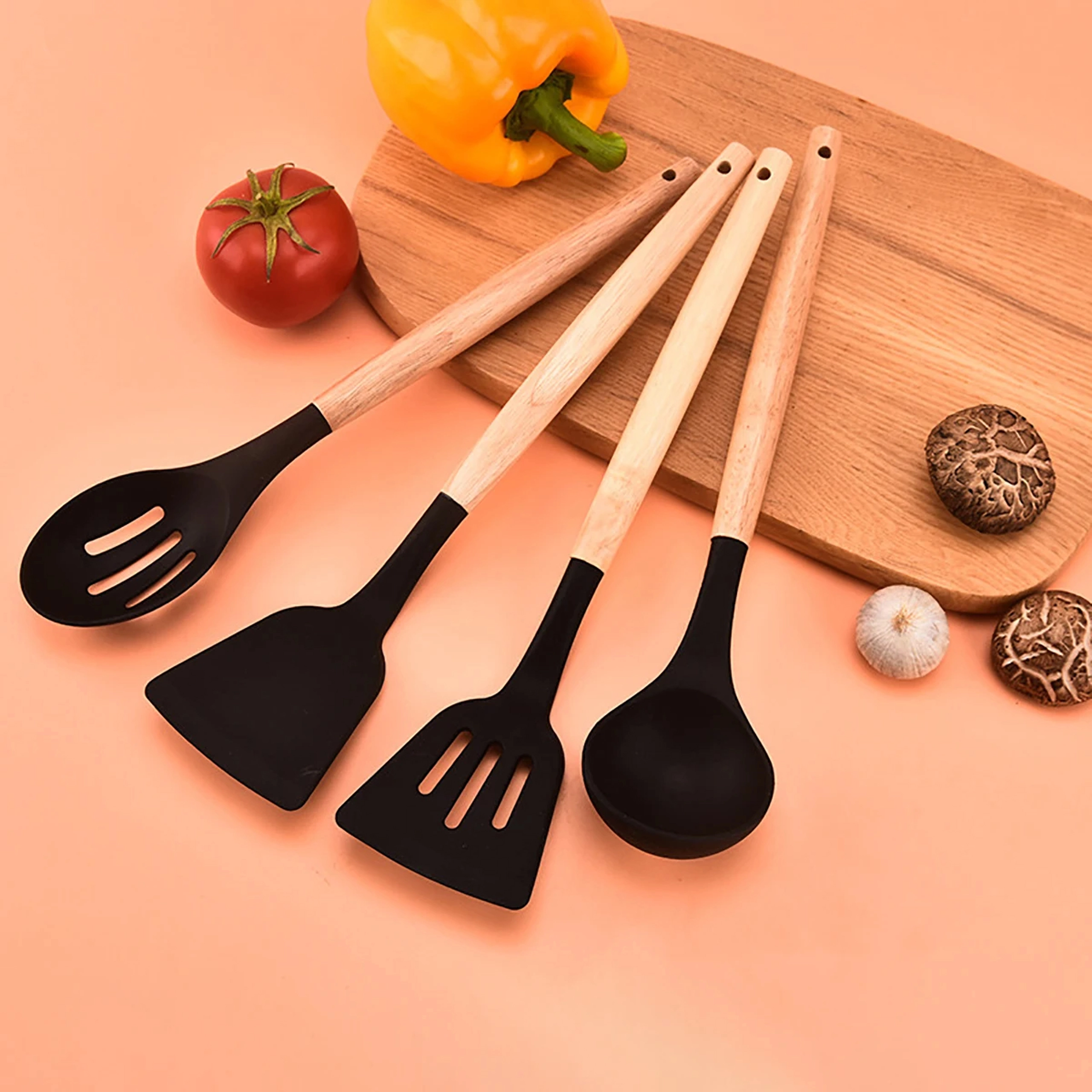 Acest set versatil de ustensile de bucătărie combină silicon durabil cu lemn natural plăcut. Capetele din silicon sunt delicate cu tigăile cu suprafață antiaderentă și se curăță ușor, iar lemnul asigură o priză sigură și confortabilă. Setul acoperă majoritatea operațiunilor de gătit și copt – de la amestecarea sosurilor până la servirea pastelor.