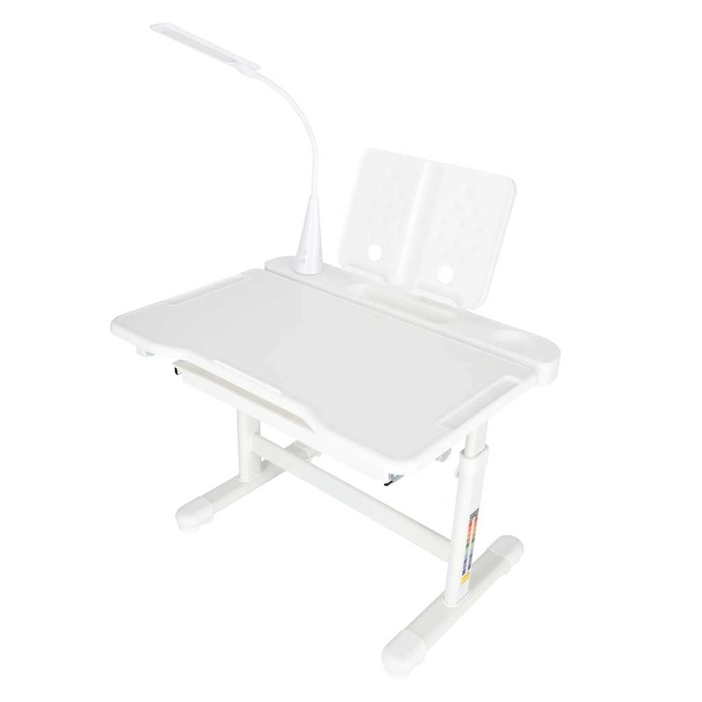 Lampa LED integrată alimentată prin USB oferă 3 culori de lumină (caldă, rece, mixtă) și 3 niveluri de intensitate pentru iluminare ideală în orice moment al zilei. Sertarul lat culisant cu compartimente și suportul pentru carte/tabletă păstrează accesoriile ordonate și la îndemână. Margini rotunjite sigure și cadru solid din metal, MDF și plastic asigură stabilitate și durabilitate.
