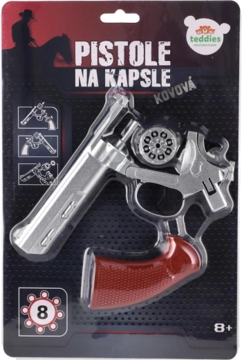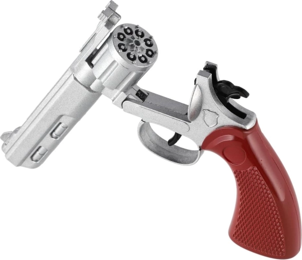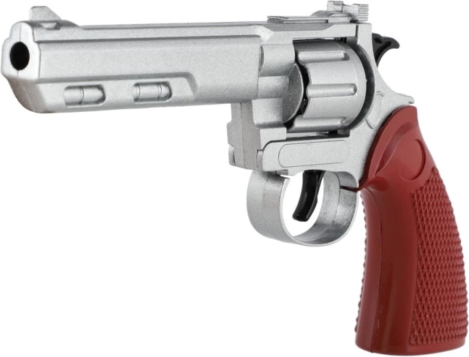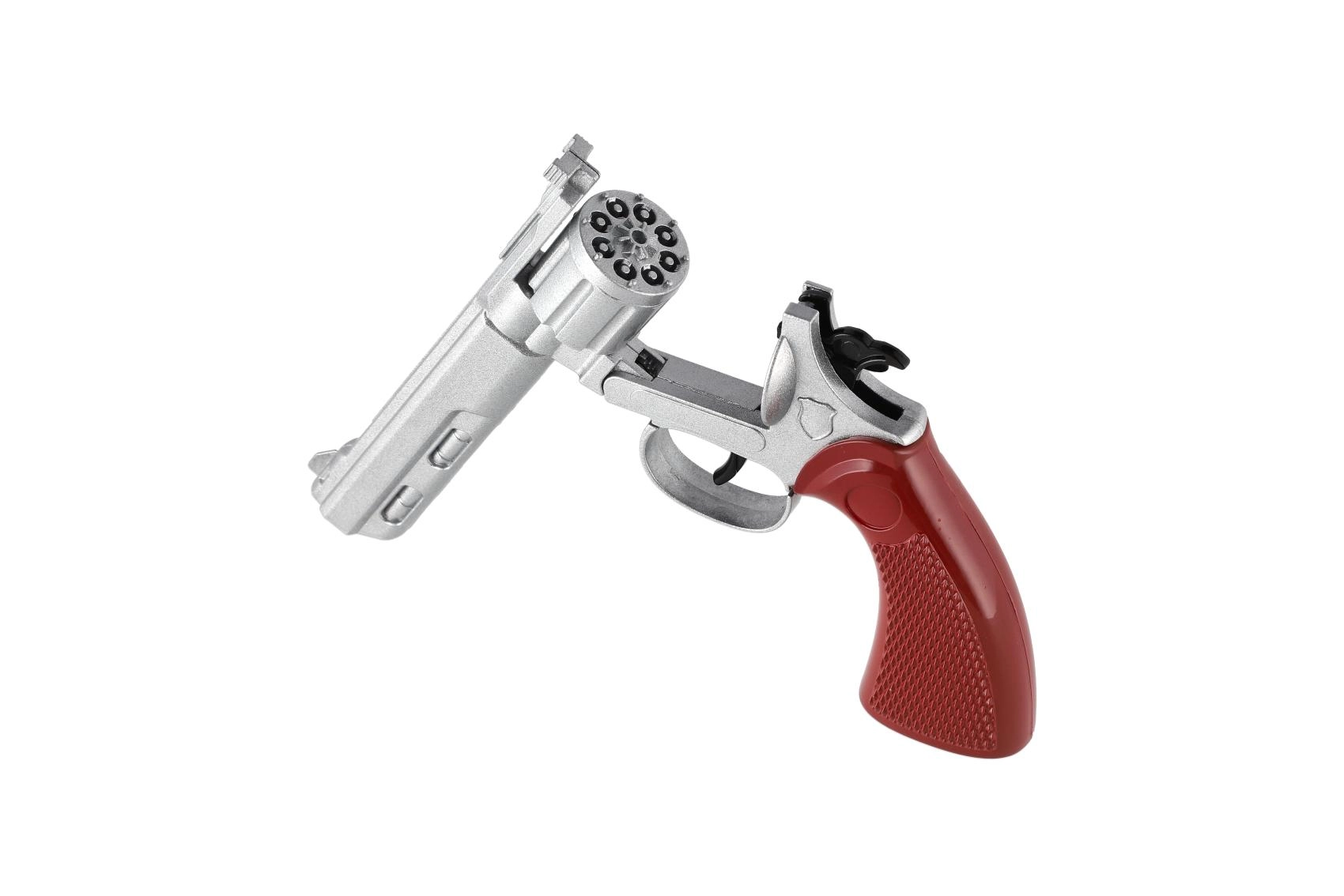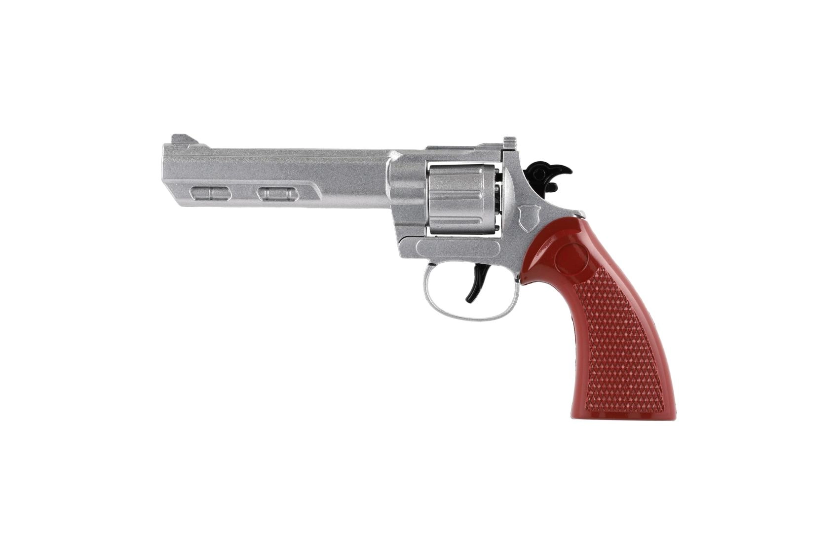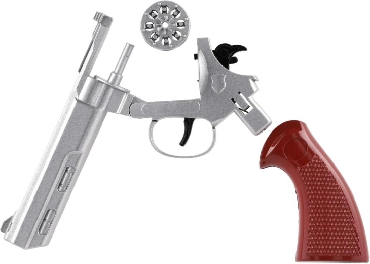 Acest revolver stilat de 22 cm oferă un aspect autentic și funcționare fiabilă pentru jocul copiilor. Corpul metalic creează un efect realist, iar sunetul produs la folosirea capselor cu 8 focuri intensifică atmosfera de aventură. Datorită mânerului ergonomic, pistolul se ține bine chiar și în timpul jocului prelungit.