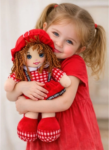 Această păpușă cusută, pufoasă, în rochiță roșie cu model mărunt în carouri, va încânta orice copil. Datorită umpluturii moi și corpului textil, este sigură încă din cea mai fragedă vârstă. Detaliile brodate ale feței, părul împletit și pălăriuța și botoșeii asortați îi conferă păpușii farmec și o expresie prietenoasă.