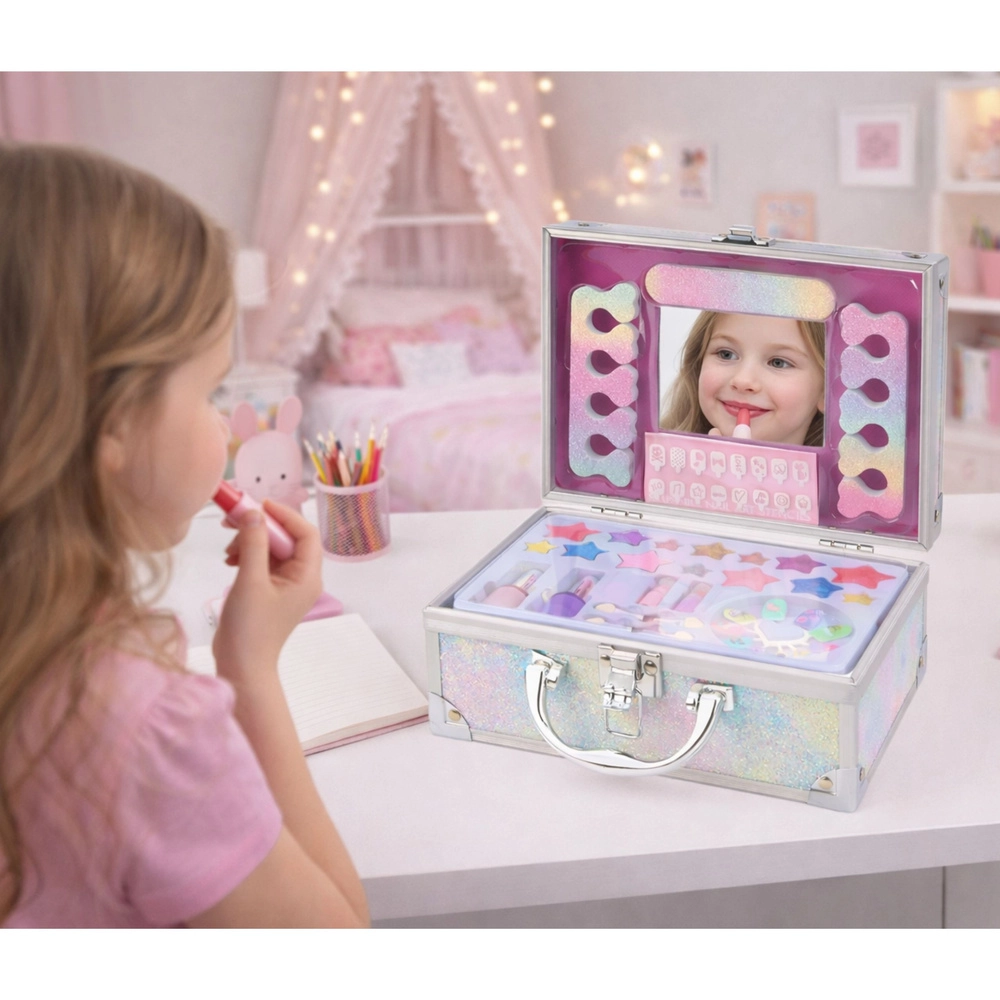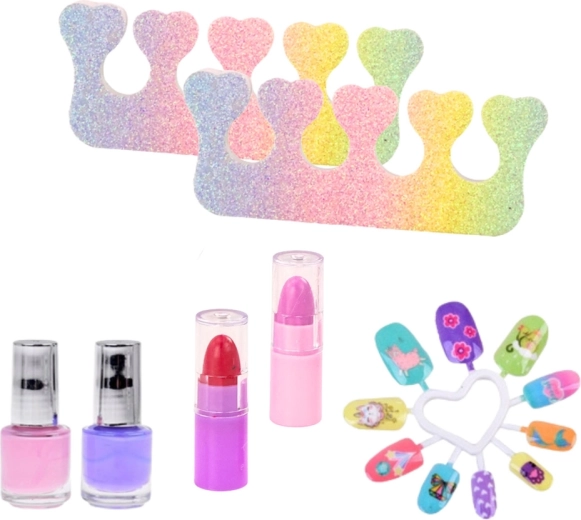 Setul complet include rujuri, farduri de pleoape, lacuri, autocolante, tipsuri, separatoare și alte accesorii – gata pentru distracție imediată.