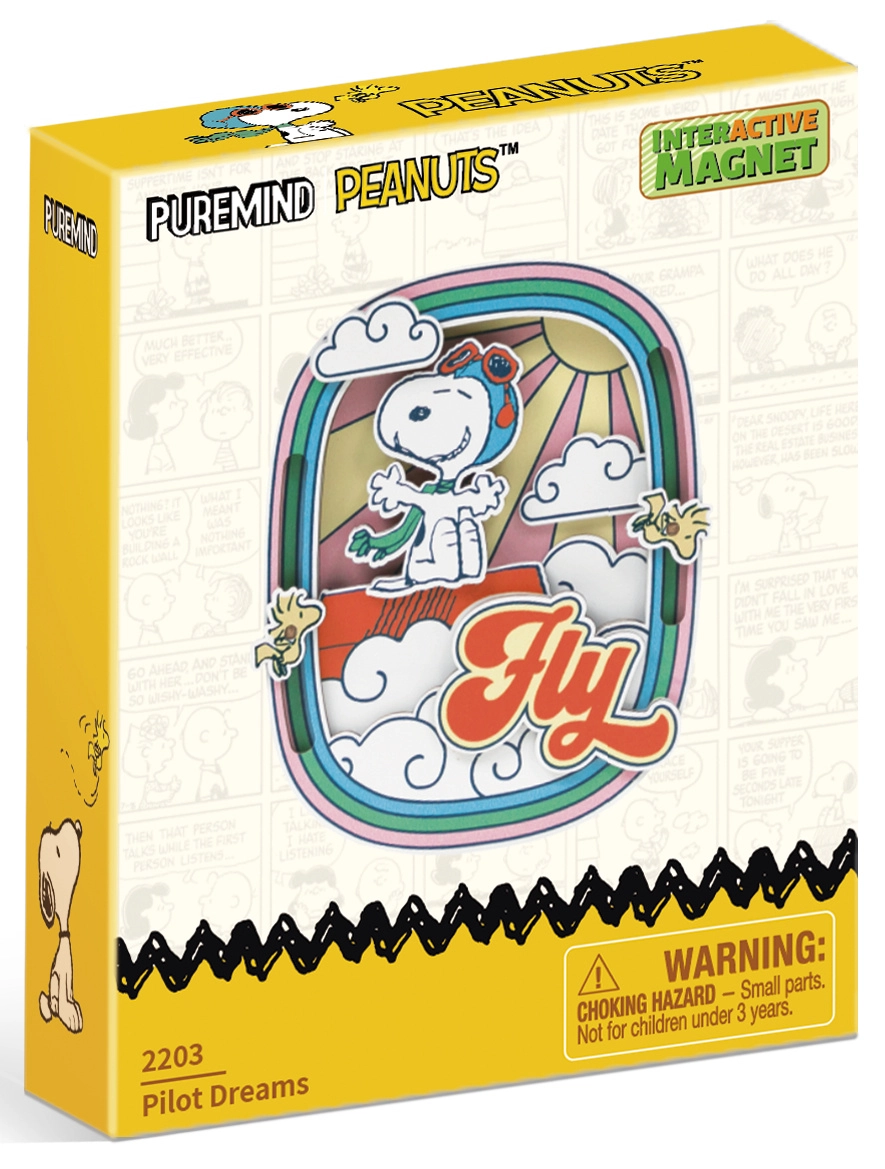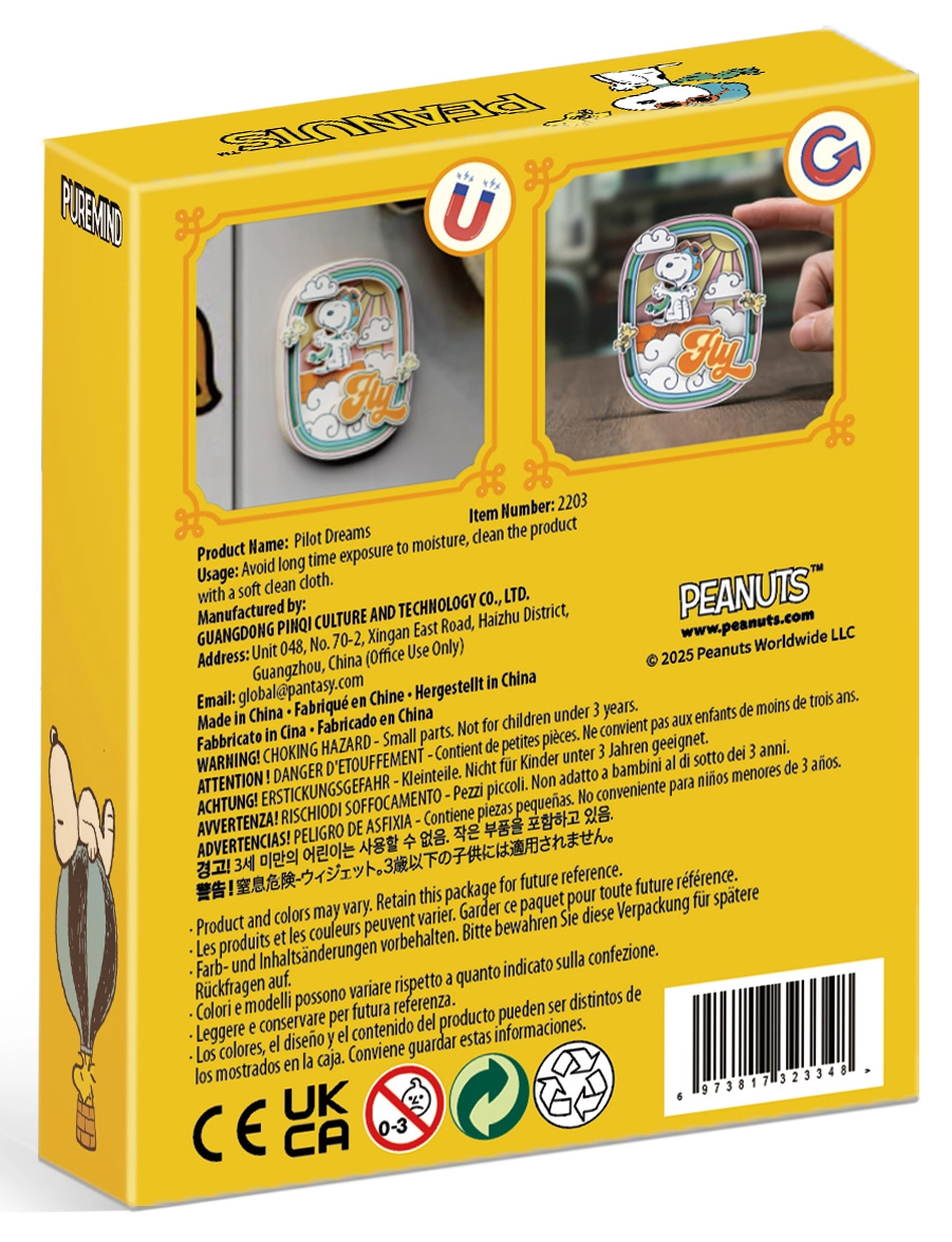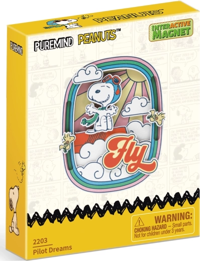 Acest magnet licențiat PUREMIND îl prezintă pe Snoopy într-o scenă aeriană dinamică cu inscripția „Fly”. Execuția din lemn multistrat cu imprimeu color creează impresia unui mic tablou 3D, care atrage privirea din prima și însuflețește camera copiilor, bucătăria sau biroul.