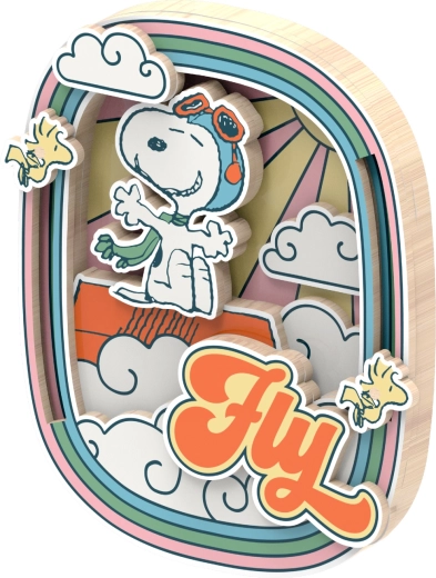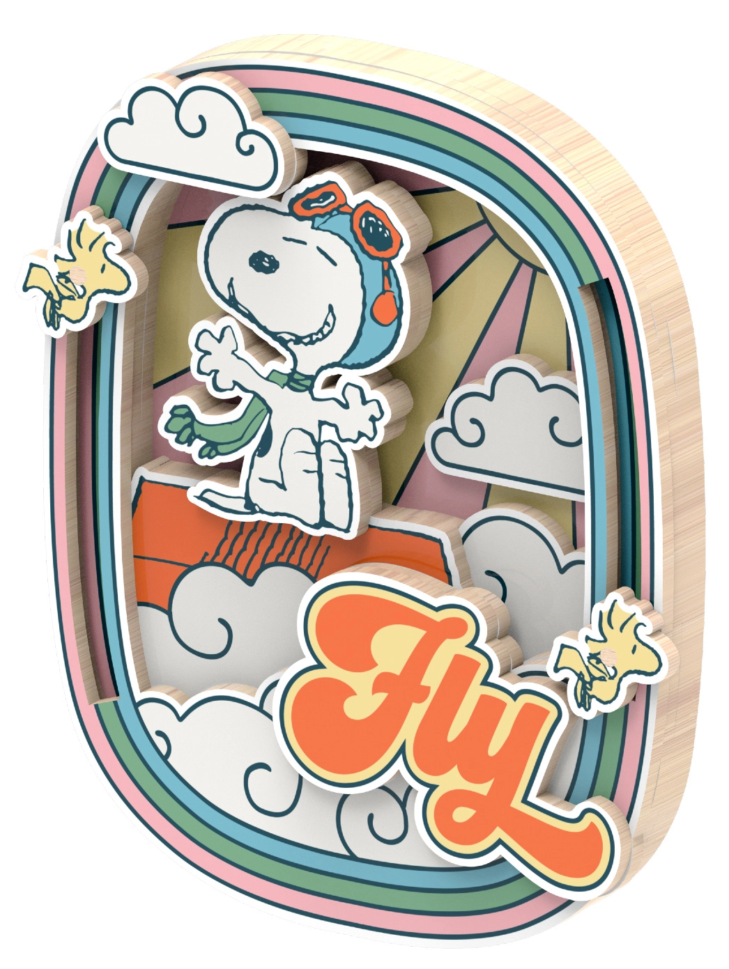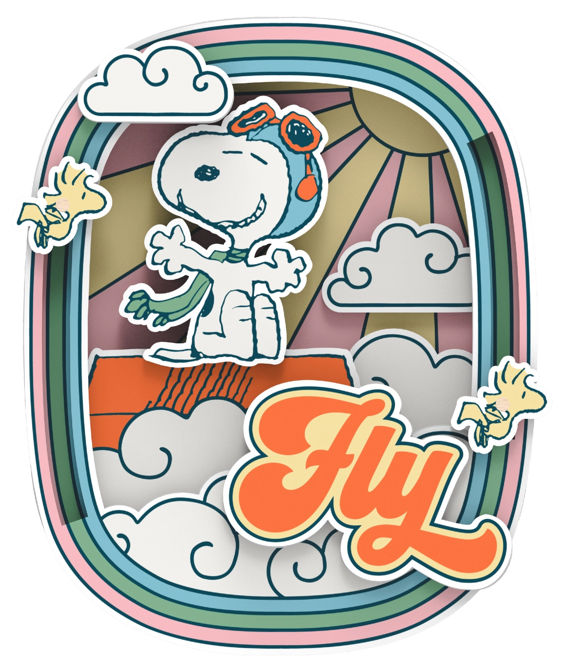 Scenă veselă cu inscripția „Fly” și personajele din PEANUTS, care aduce nostalgia benzilor desenate și bucurie în spațiul de zi cu zi.