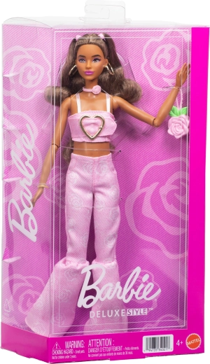Această păpușă la modă aduce un stil fresh inspirat de cele mai noi tendințe. Ținuta este formată din top scurt cu inimioară și pantaloni lungi evazați cu model roz. Look-ul este completat de o geantă roz în formă de trandafir, un colier cu motiv de trandafir și cercei statement – totul asortat într-o stilizare unitară și de efect.