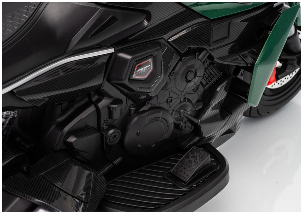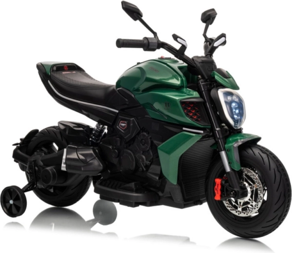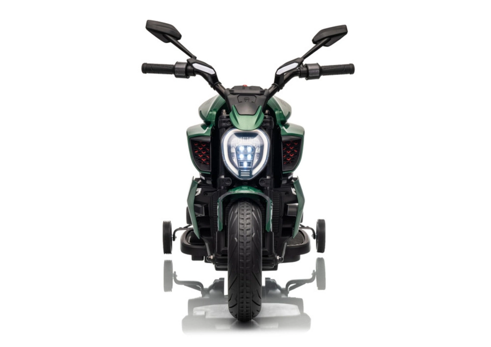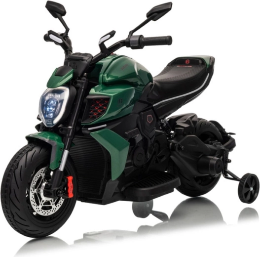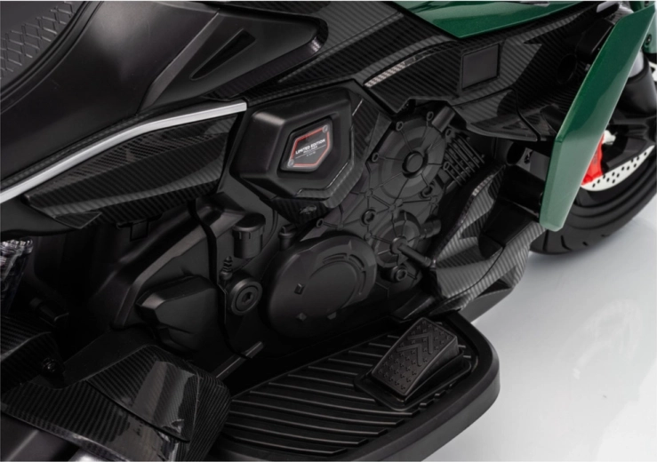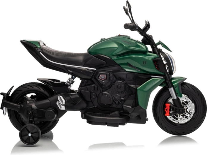 Motocicleta electrică pentru copii în culoarea verde impresionează prin aspectul sportiv și construcția sigură. Datorită anvelopelor late și roților laterale de stabilizare, copiii capătă rapid încredere, în timp ce farul LED luminos și detaliile realiste (oglinzi retrovizoare, frâne cu disc de aspect realist) intensifică experiența autentică de motociclist.
