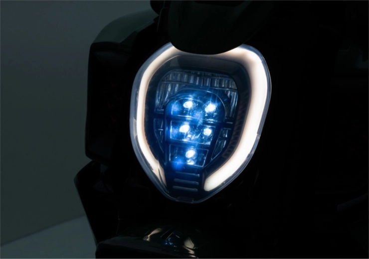 Farul frontal LED integrat sporește vizibilitatea și oferă motocicletei un aspect realist de sportivă de șosea.