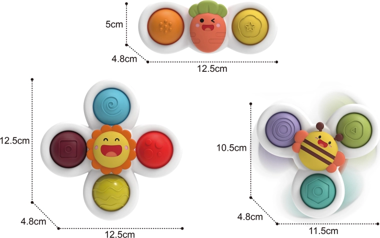 Descoperiți farmecul jocului simplu care dezvoltă. Setul WOOPIE BABY oferă spinnere tematice (morcov, albinuță, soare) cu rulmenți de calitate pentru rotire lină și silențioasă. Ventuzele permit fixarea jucăriei pe suprafețe netede – fereastră, faianță sau cadă – și oferă joacă în apă, deoarece jucăria poate fi scufundată în siguranță.