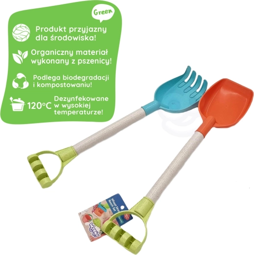 Setul ecologic pentru nisip WOOPIE GREEN include o lopățică și o greblă cu lungimea de 51 cm, în design pastel modern. Fabricat din material organic, biodegradabil, potrivit pentru compostare, sigur pentru copii (dezinfectat la 120 °C). Ideal pentru locul de joacă cu nisip, plajă și grădină.