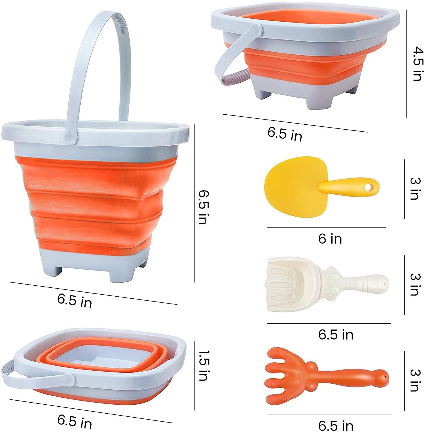 În pachet găsiți găleata, lopățica și grebla – tot ce este necesar pentru castele de nisip, transportul apei și joacă creativă pe plajă.