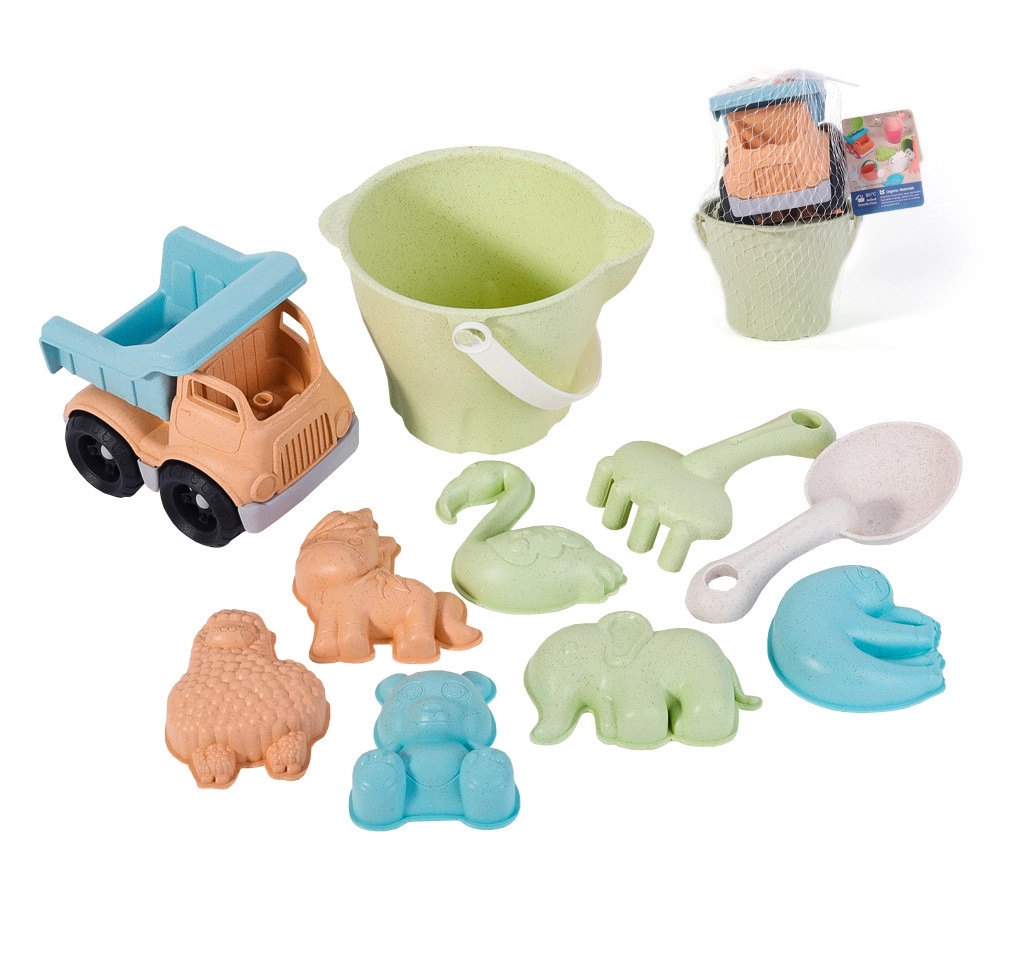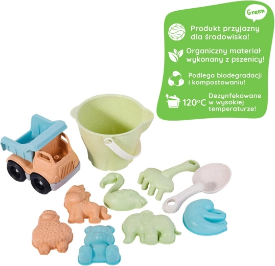 Descoperă distracția jucăușă și în același timp prietenoasă cu mediul cu setul pentru nisip WOOPIE GREEN. Acest set din 11 piese, în culori pastel moderne, include găletușă, stropitoare, camion basculant, lopeți și forme cu animale pentru construit și creat. Fabricat din material organic, biodegradabil pe bază de paie de grâu și potrivit pentru compostare. Datorită marginilor rotunjite, mânere confortabile și dezinfectării la 120 °C, setul este sigur pentru copii și ideal pentru nisipar, plajă și grădină.