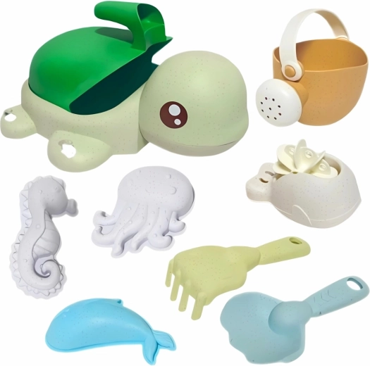 Ce găsești în set: găleată/broască țestoasă cu ventuze, stropitoare, lopățică, greblă, lingură, roată‑moară și 3 forme (viețuitoare marine). Culorile pastelate și formele rotunjite sunt prietenoase și pentru copiii mai mici, de la 3 ani. Materialul este biodegradabil și compostabil, astfel încât copiii se joacă responsabil față de natură.