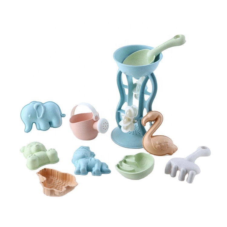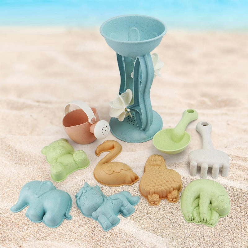 Stropitoarea, lopățica, grebla și cele 6 forme completează moara într-un set practic pentru nisip și plajă. Culorile pastelate și formele rotunjite invită la joacă.