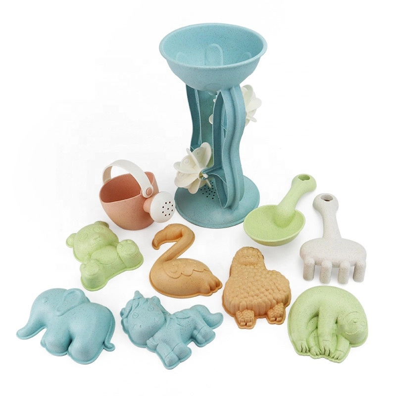 Moara pentru nisip și apă funcțională ilustrează perfect principiile curgerii și mișcării – este suficient să turnați nisip sau apă și roțile încep să se învârtă. Stropitoarea, lopățica, grebla și formele cu animale susțin motricitatea fină, creativitatea și gândirea spațială.