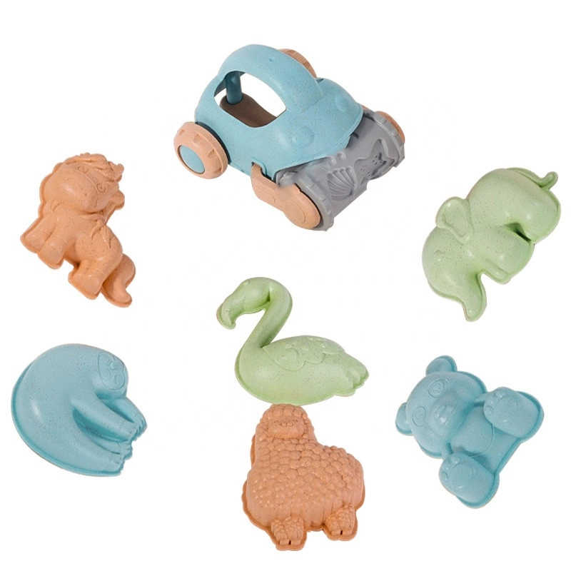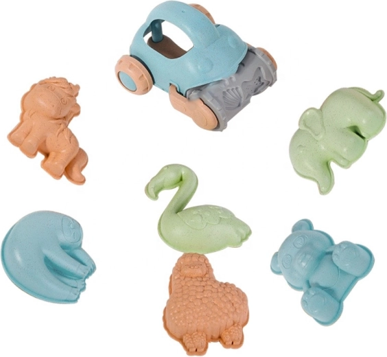 Găletușă, lopățică, greblă, 6 forme și o mașinuță – tot ce au nevoie copiii pentru a construi castele și a crea amprente drăguțe în nisip.