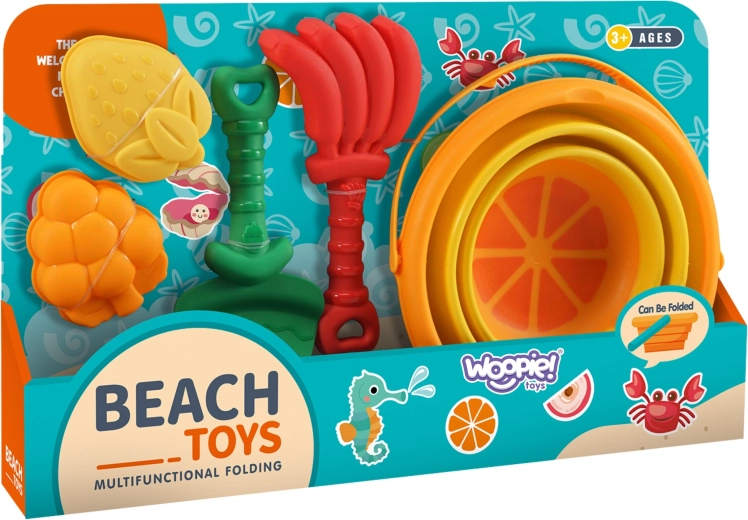 Setul colorat de plajă pentru nisip, cu motiv de fructe tropicale de la WOOPIE, este ideal pentru copii, atât la nisipar, cât și pe plajă. Oferă un design compact, plastic durabil și sigur și forme și unelte distractive, care susțin creativitatea și motricitatea fină.