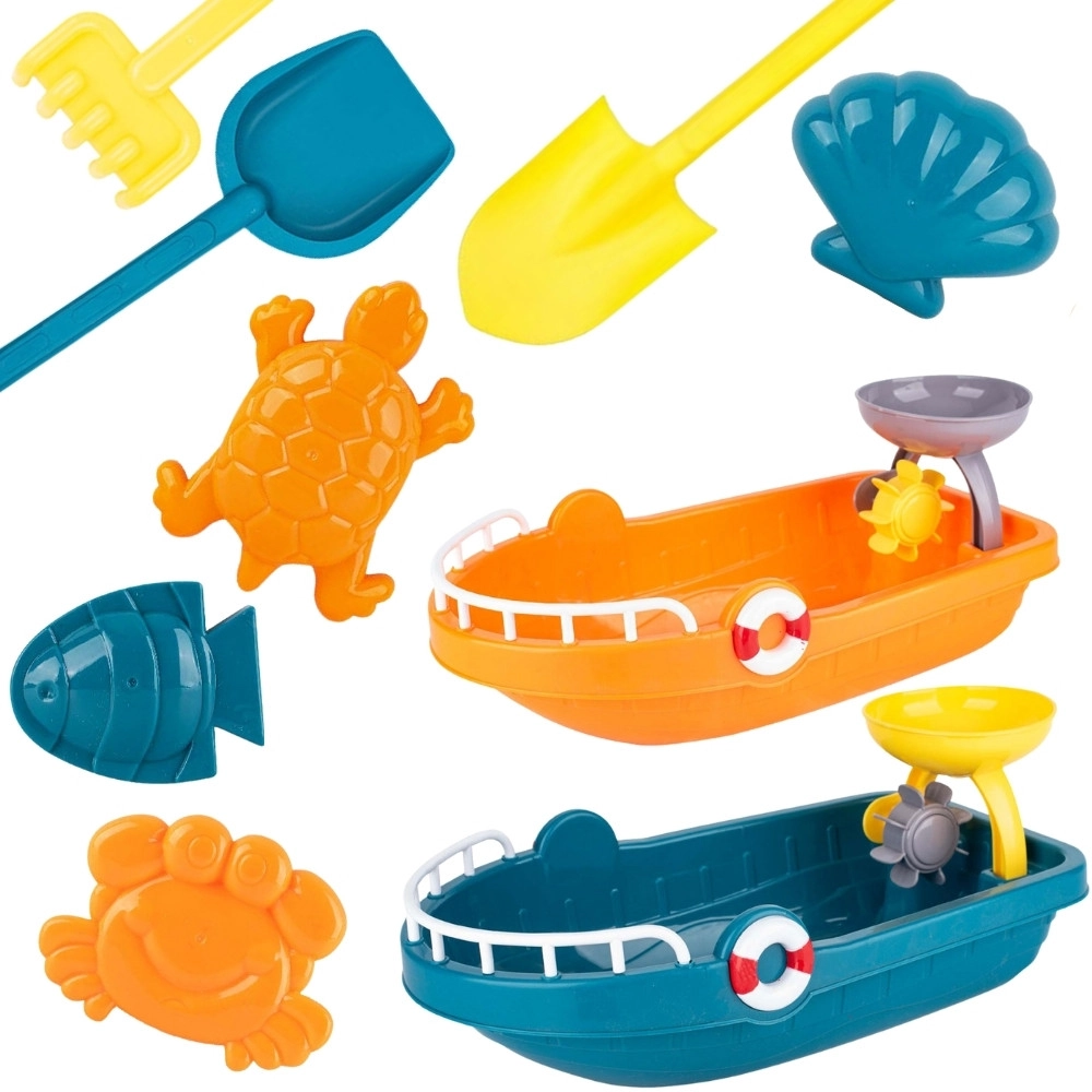 Descoperiți setul universal cu barcă, care le permite copiilor să ia, să cearnă și să toarne nisip sau apă, să creeze forme și să urmărească caruselul apei și nisipului în moară. Barca mare servește totodată ca cutie de depozitare pentru toate accesoriile, astfel încât aveți totul la un loc și gata de drum.