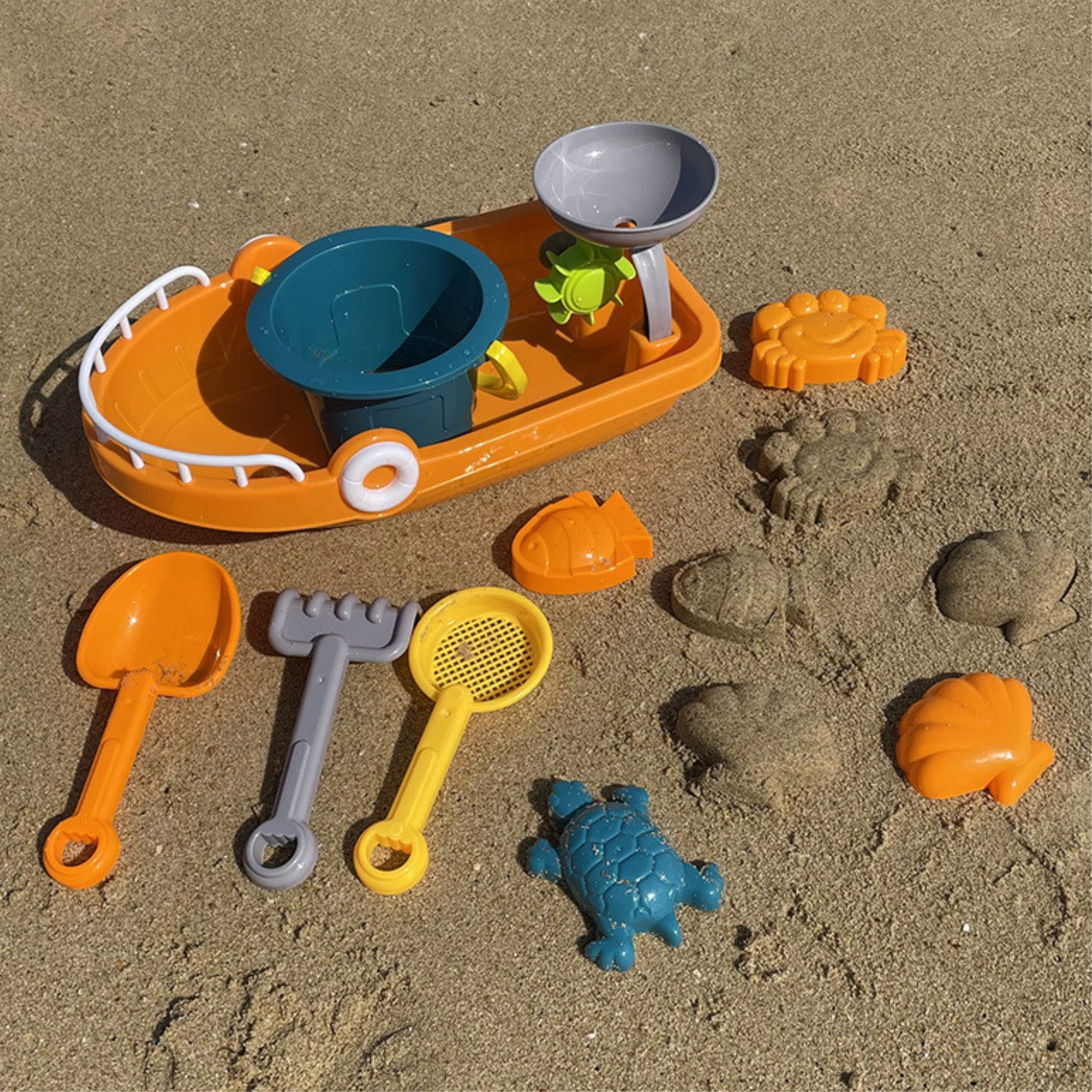 Lopățică, greblă, sită, găletușă și forme marine susțin construirea creativă, cernerea și modelarea pe plajă și în groapa cu nisip.