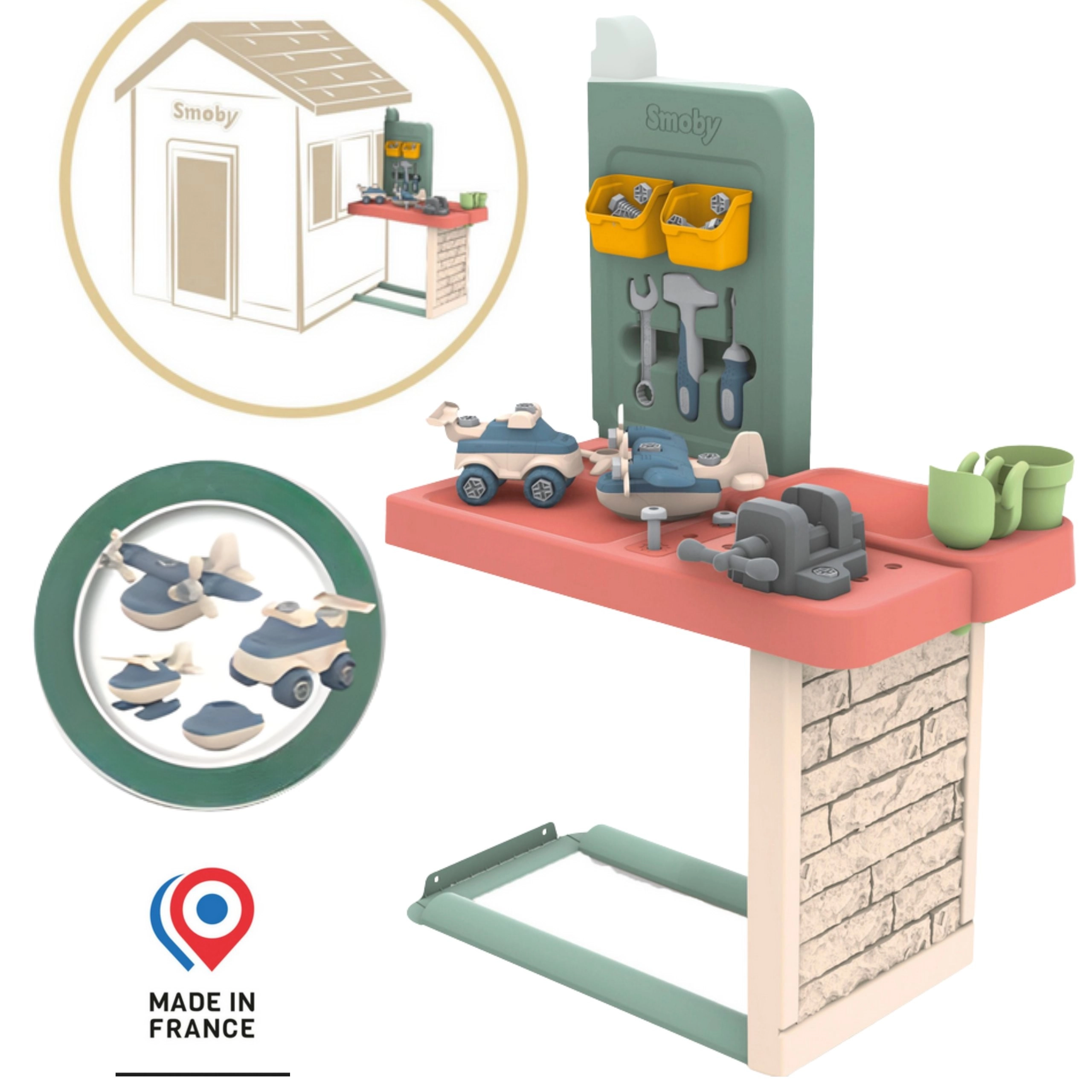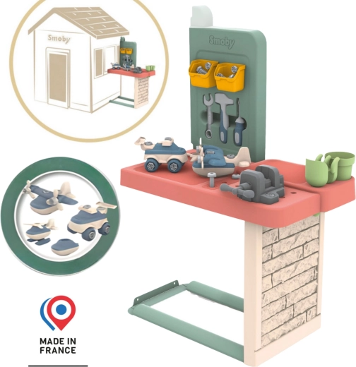 Extindeți căsuța pentru copii SMOBY Life cu un set de atelier practic, cu măsuță anexă și 39 de piese de unelte și accesorii. Micii meșteri de la 2 ani se vor bucura de asamblare sigură, construit și învățarea de abilități noi. Nu lipsesc spațiul generos de lucru, polițele de depozitare și modelele de asamblat – mașină și elicopter. Construcția este rezistentă la UV și realizată cu un procent ridicat de materiale reciclate, pentru distracție îndelungată afară și în interior.