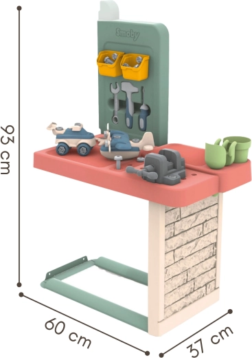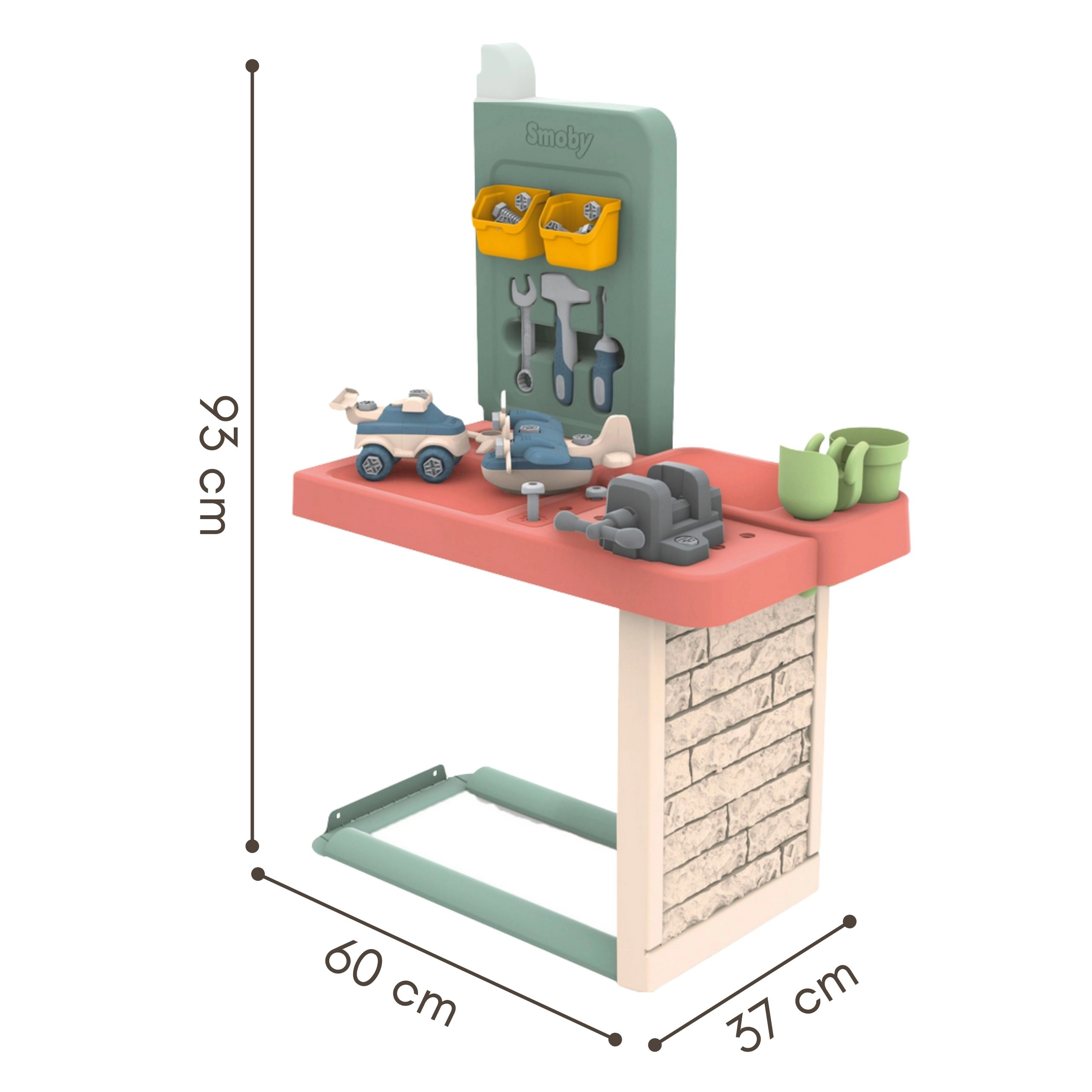 Această măsuță anexă de atelier este un accesoriu ideal pentru căsuțele modulare SMOBY Life. Datorită organizării bine gândite și setului bogat de unelte, le permite copiilor să descopere în siguranță lumea bricolajului, să-și dezvolte motricitatea fină, coordonarea și gândirea logică. Suprafața de lucru largă și polițele de depozitare păstrează totul la locul lui, pentru un joc clar și distractiv.
