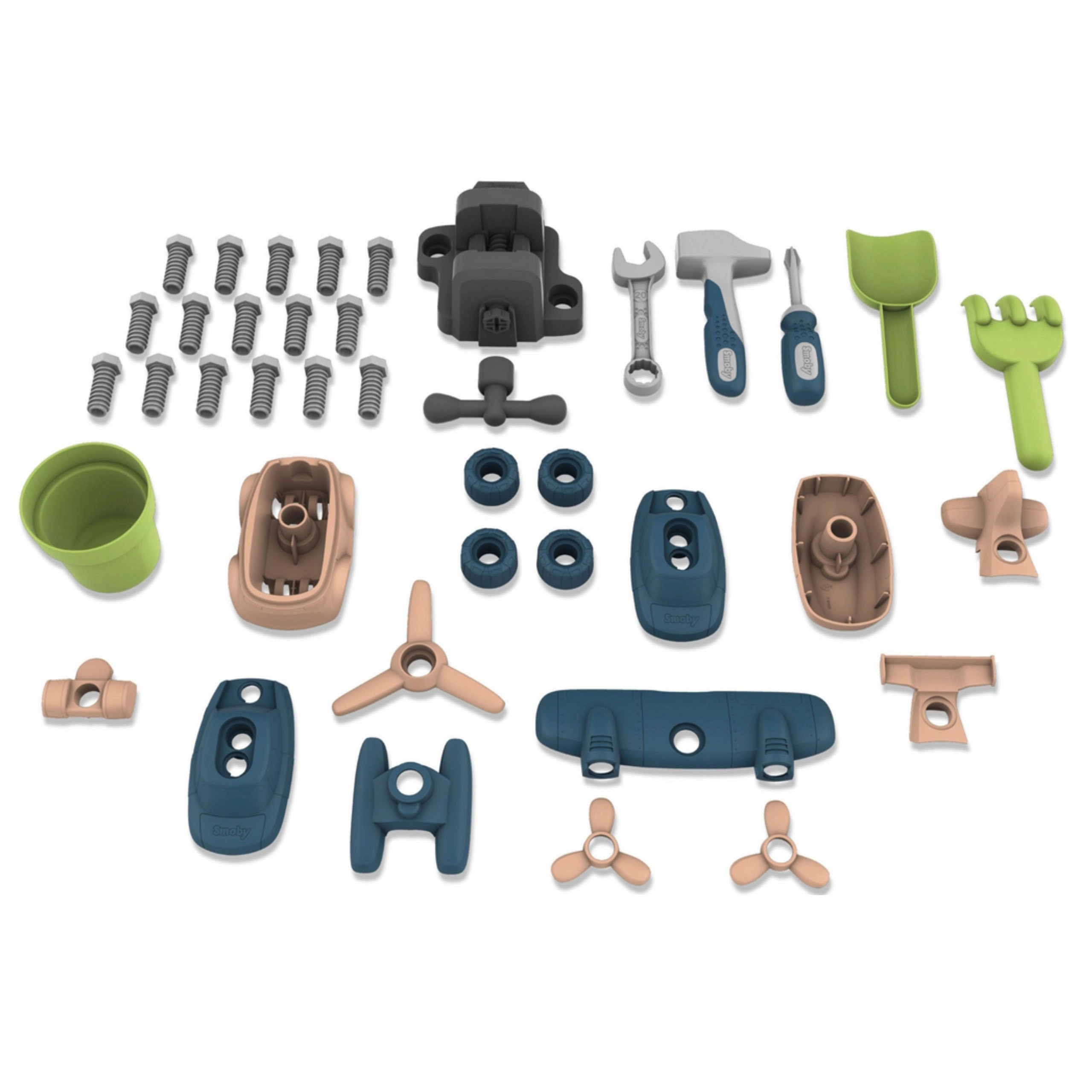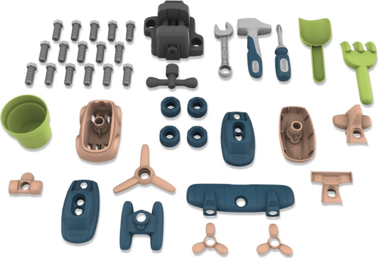 Sunt incluse 39 de elemente, printre care ciocănel, șurubelniță, chei și elemente de fixare. Copiii pot asambla singuri o mașină și un elicopter, exersând răbdarea, precizia și sentimentul de reușită. Materialul este durabil, stabil la UV și conține un procent ridicat de material reciclat – perfect pentru utilizare îndelungată în grădină sau în casă.