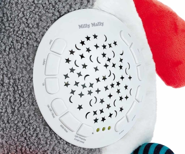 Lampa de noapte din pluș panda cu proiector MILLY MALLY creează o atmosferă liniștitoare pentru adormire ușoară. Proiecțiile luminoase delicate ale stelelor și lunii în culori diferite sunt completate de melodii calmante și sunete din natură, care liniștesc copiii în mod natural.