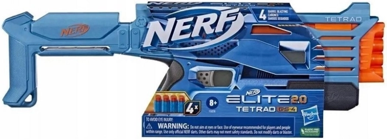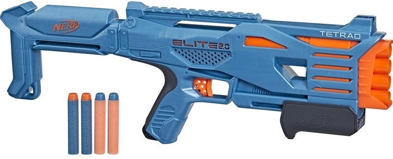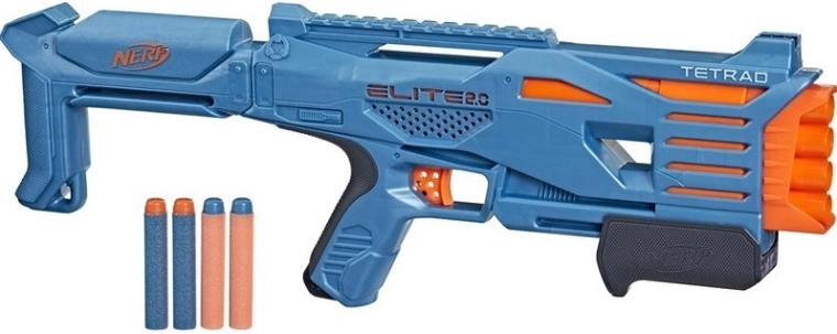 Nerf Elite 2.0 Tetrad QS-4 este o pistolă compactă pentru săgeți din spumă, ideală pentru lupte alerte în curte sau în living. Datorită celor patru camere/țevi, permite foc rapid consecutiv fără reîncărcări complicate, astfel încât rămâi în joc mai mult timp.