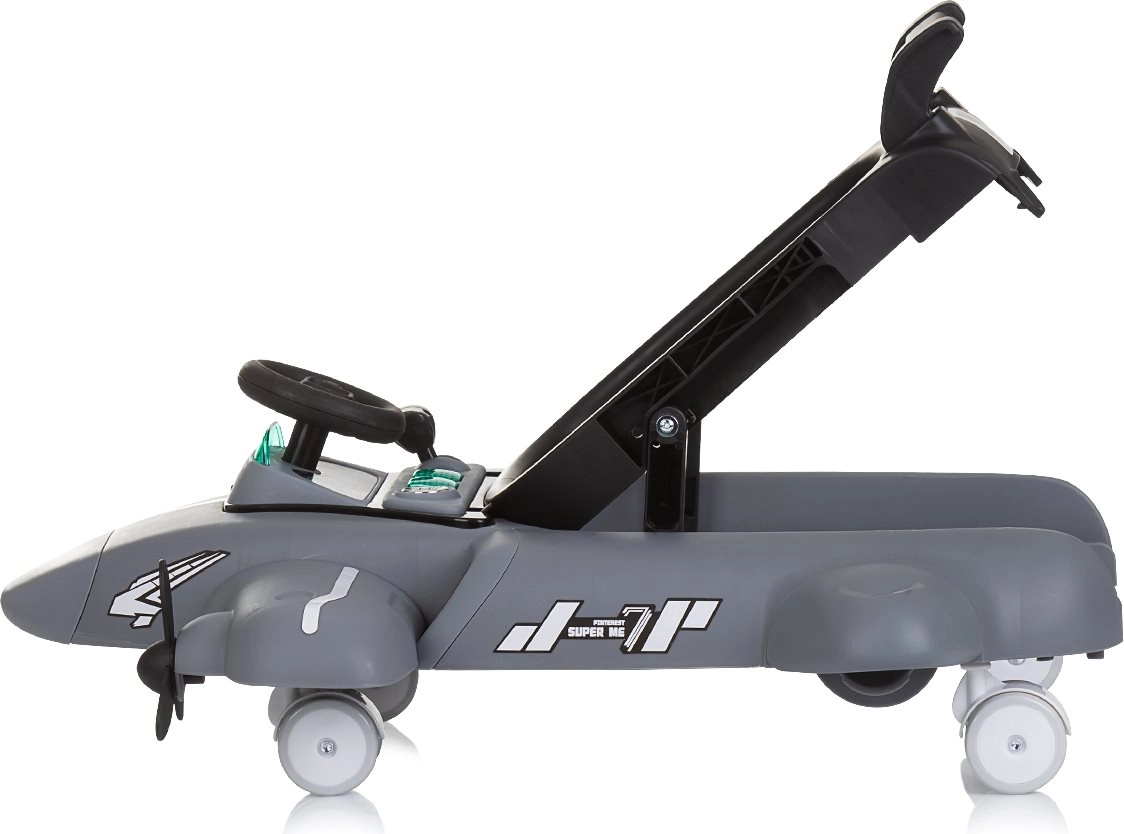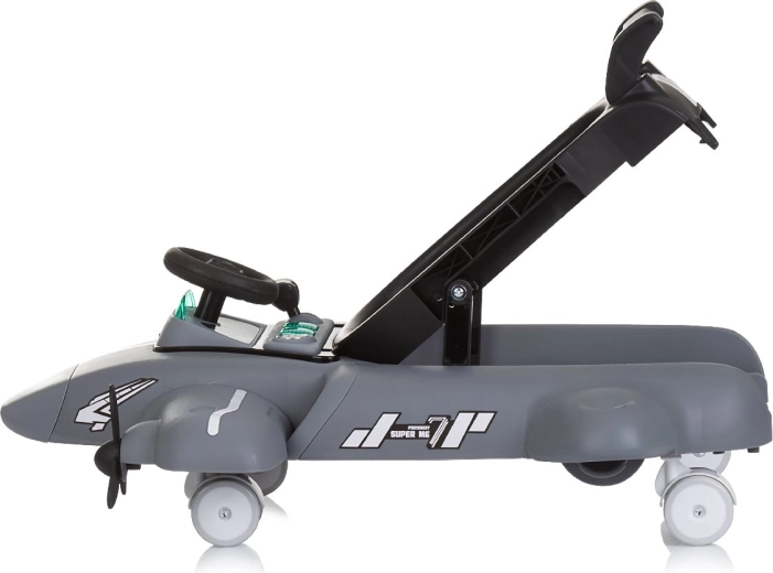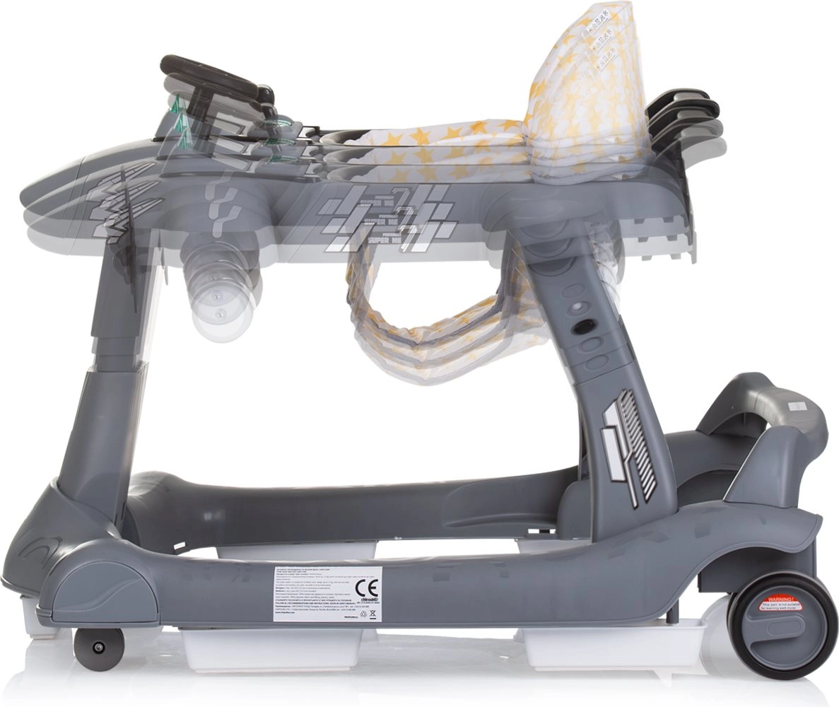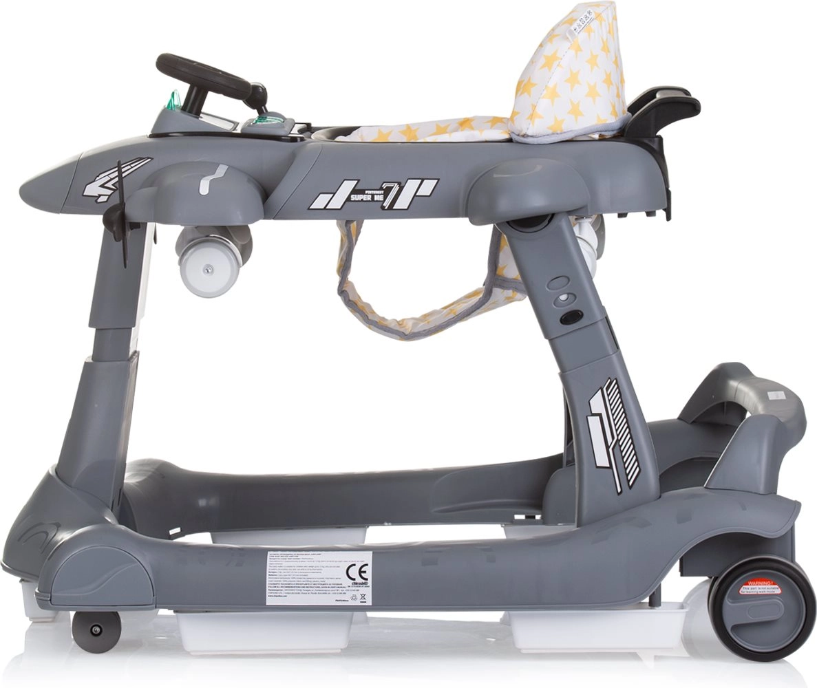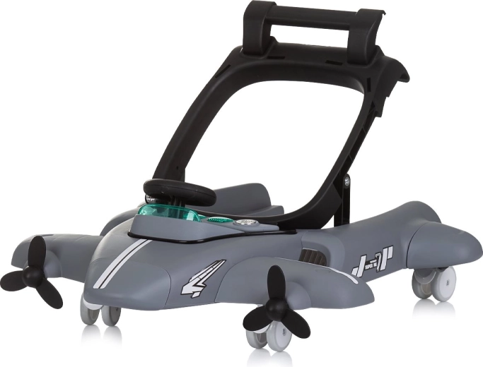 Premergător interactiv 3în1 CHIPOLINO Airplane Grey susține primii pași, echilibrul și coordonarea copilului încă de la 6 luni. Oferă un panou colorat cu sunete și jucării, o bază largă și stabilă, 3 niveluri de înălțime a scaunului și posibilitatea de transformare în jucărie de împins – avion. Include reglarea vitezei, blocarea roților din spate și opritoare de siguranță pentru protecție maximă.