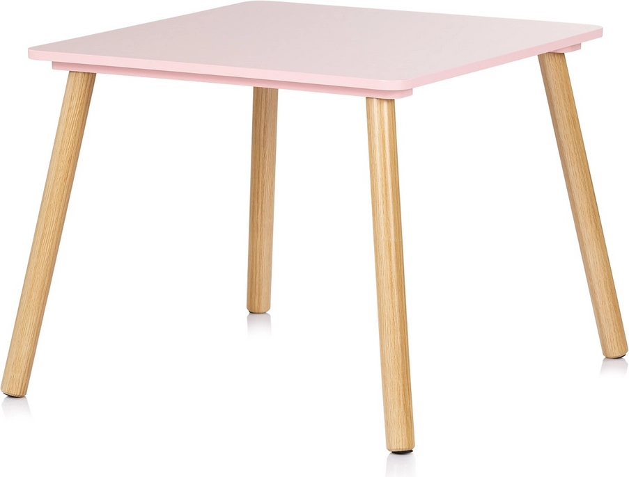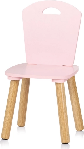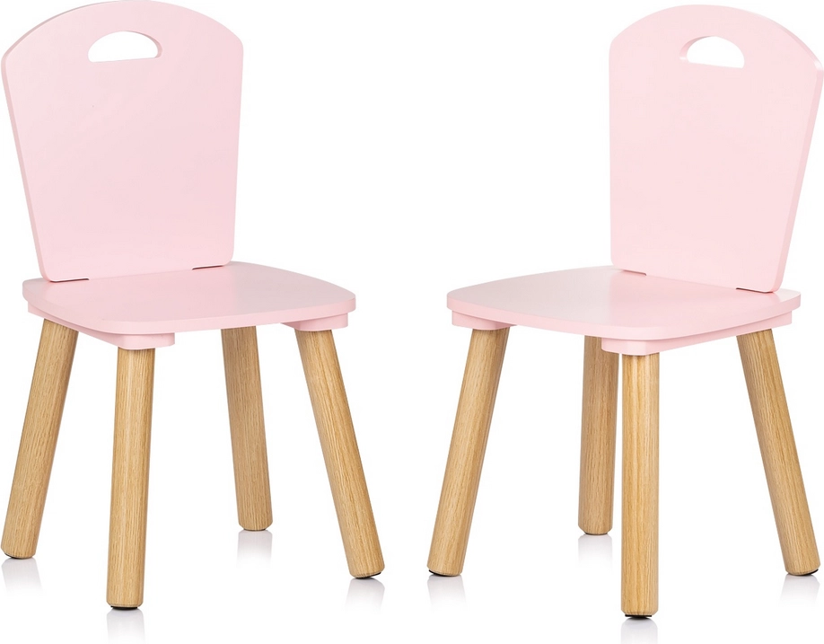 Set stilat și sigur pentru camera copilului: masă pentru copii și două scaune în nuanță delicată de roz, cu picioare naturale din lemn. Muchii rotunjite pentru siguranță maximă, construcție solidă din MDF de calitate și dimensiuni ergonomice pentru joacă, creație și primele activități de învățare.