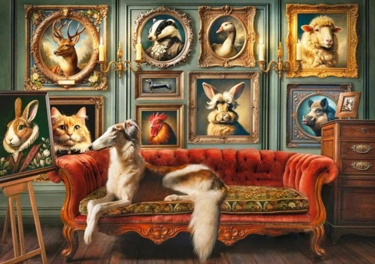 Descoperiți motivul elegant „Menajeria aristocratică”, care îmbină umorul fin cu detalii atent lucrate. Puzzle-ul de 1000 de piese este o alegere excelentă atât pentru începători, cât și pentru avansați, care caută o provocare echilibrată și o execuție de calitate. După asamblare veți obține o imagine cu dimensiunea de aproximativ 70 × 50 cm, potrivită pentru înrămare și expunere.