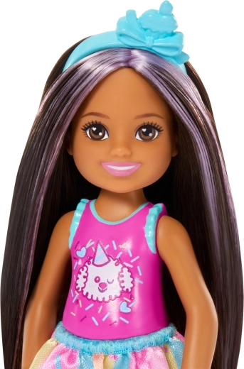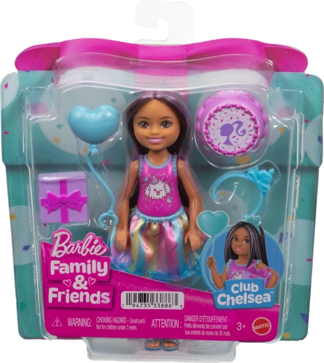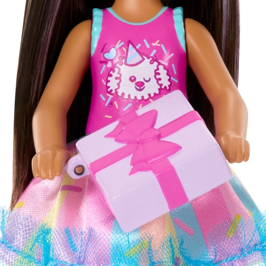 Adorabila păpușă Barbie Club Chelsea aduce distracție de ziua de naștere în orice joc. Păpușa mică, de aproximativ 13 cm, are păr lung, închis, cu șuvițe mov, poartă un top drăgălaș cu cățeluș, o fustiță colorată și sandale bleu. Setul include accesorii tematice pentru petrecerea de ziua de naștere – balon, cadou, bentiță și tort – care încurajează jocul de rol creativ și inventarea propriilor povești.
