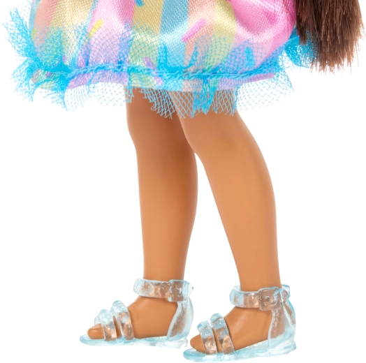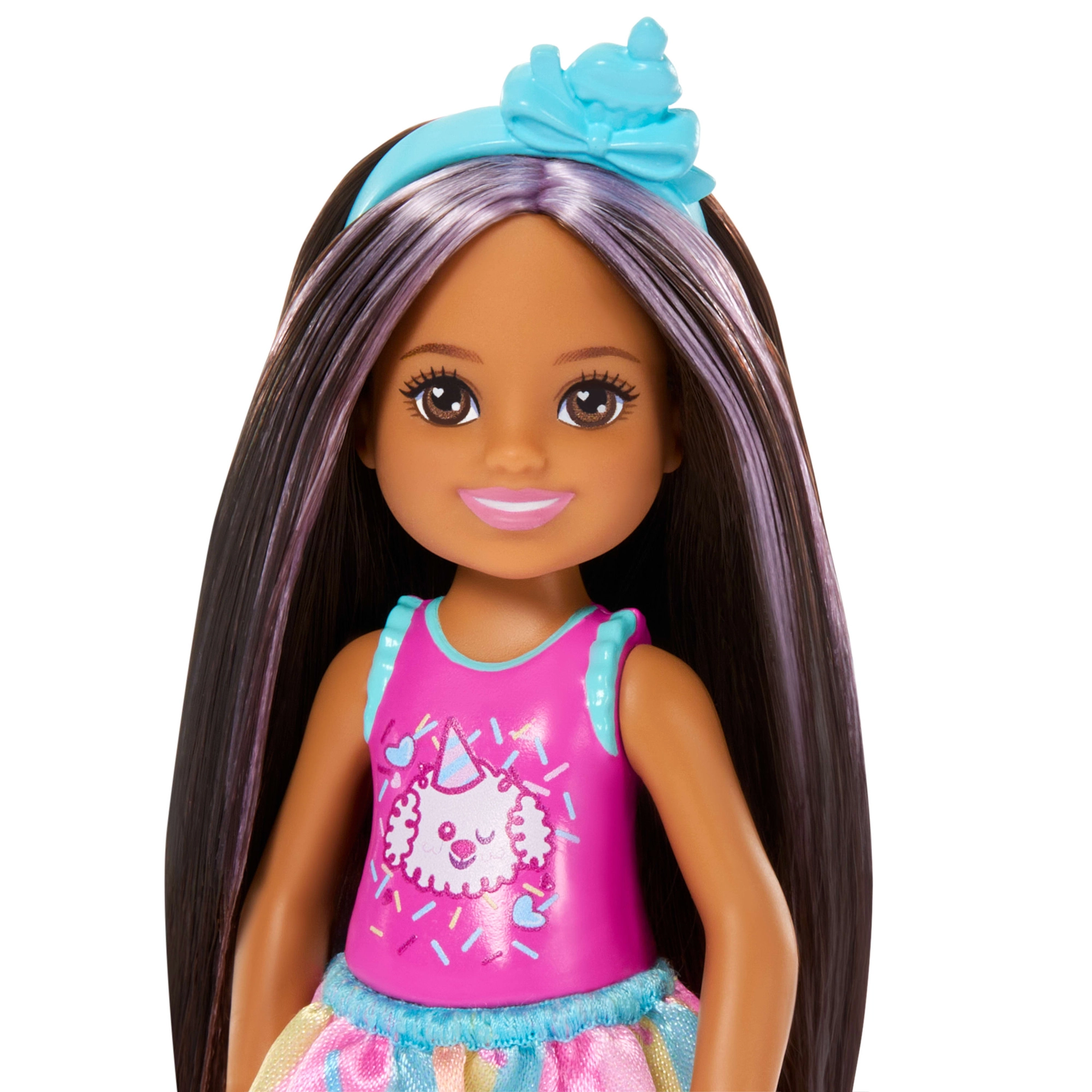 Pachetul include tot ce este necesar pentru o petrecere perfectă: bentiță în stil cupcake, balon în formă de inimă, cadou și tort aniversar. Hăinuțele sunt detașabile, astfel încât copiii se pot bucura de îmbrăcare și jocuri de modă. Păpușa Chelsea este grozavă pentru colecție și se combină ușor cu alte produse BARBIE.