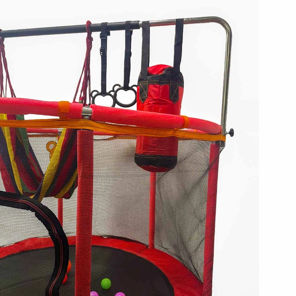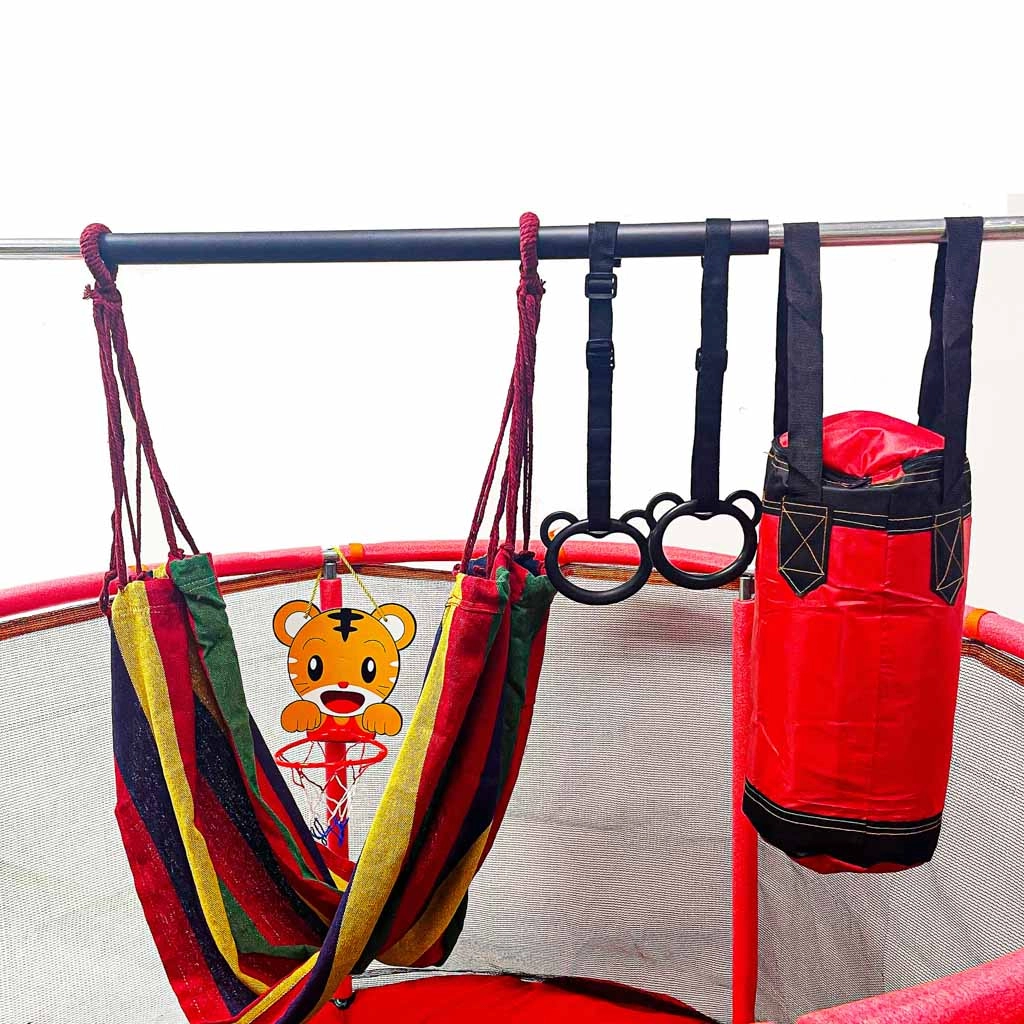 Setul bogat de accesorii duce distracția la nivelul următor: coș de baschet drăguț cu mingiuță și pompă, mingi colorate pentru jocuri, hamac confortabil cu săculeț de depozitare, mânere cu chingi pentru antrenament și sac de box cu mănuși. Datorită construcției bine gândite și capacității de încărcare de până la 150 kg, copiii se vor bucura de utilizare intensivă și de durată.