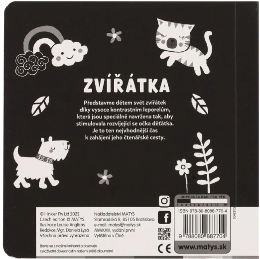Descoperă primele lecturi pentru cei mai mici: un leporelo cu contrast ridicat cu animăluțe, format 16 × 16 cm, ideal de la 0 luni. Ilustrațiile alb-negru cu contrast susțin stimularea vizuală, dezvoltarea atenției și primele percepții ale formelor.