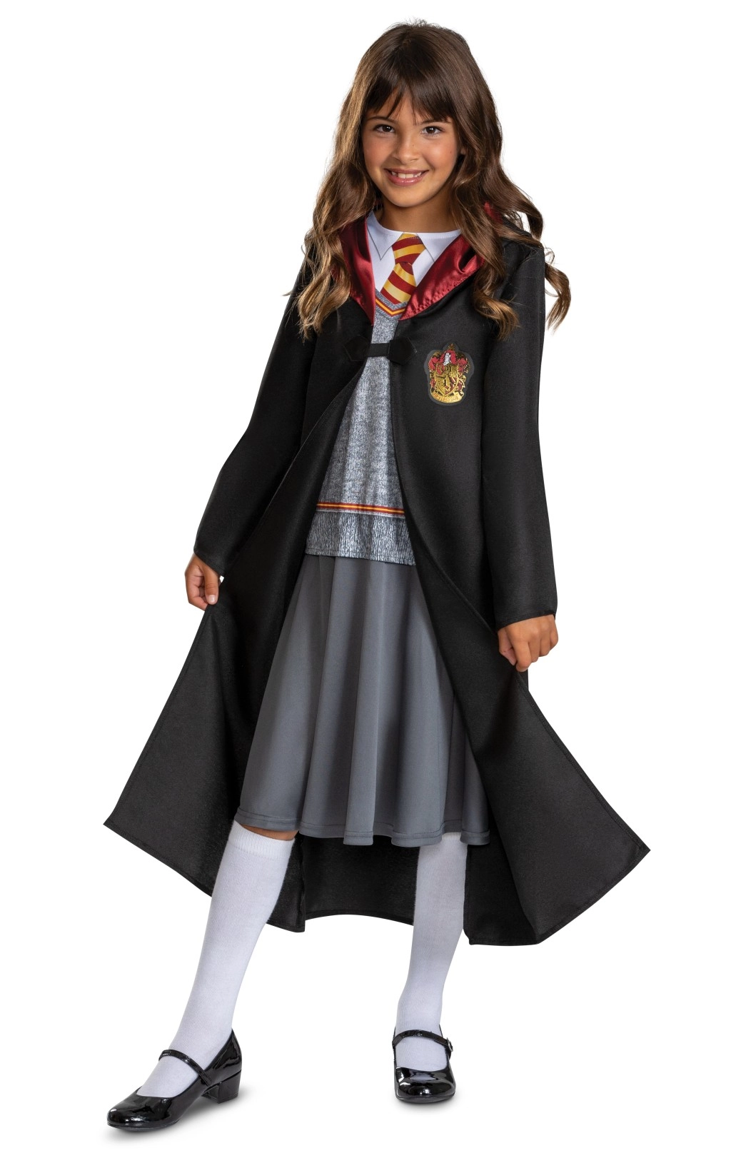 Acest costum de vrăjitor îi va încânta pe toți tinerii fani ai Hogwarts. Roba neagră este decorată cu stema Gryffindor brodată și guler cu căptușeală satinată roșie pentru un aspect elegant. Sub robă este integrată o parte din uniforma școlară – cămașă albă, pulover gri cu tiv portocaliu, cravată roșu‑aurie și fustă gri cusută, cu pliuri fine.