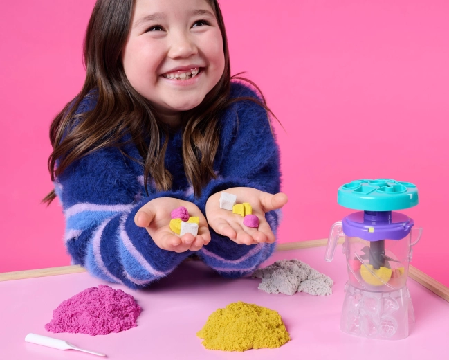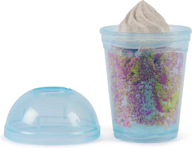 Cu Kinetic Sand smoothie mixer, copiii învață să amestece culorile și să stratifice „băuturi” și „deserturi” în pahare sau în forme pentru înghețată pe băț. Este suficient să turnați nisipul în capacul mixerului, să rotiți manual și să urmăriți cum apar nuanțe noi și texturi realiste. Nisipul cinetic pare umed, însă mâinile rămân uscate și suprafața de lucru mai curată.
