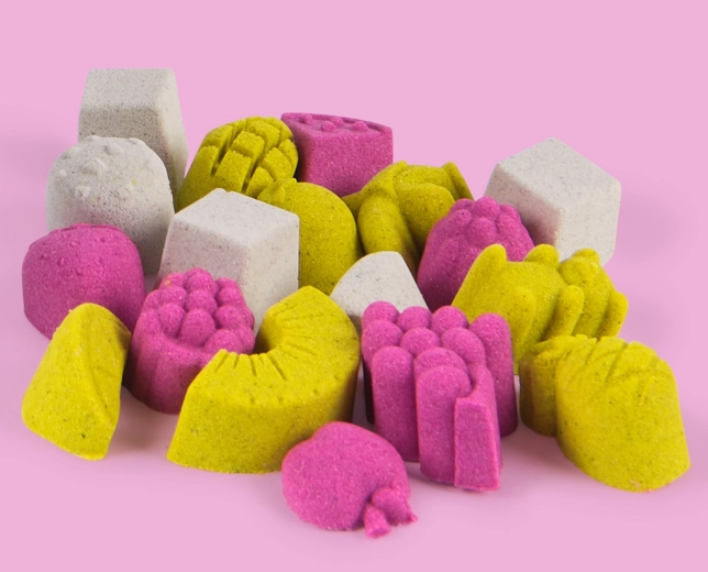 Nisipul de calitate redă perfect detaliile formelor, astfel încât copiii creează ușor forme, glazuri și accesorii. Jocul susține scenarii de rol (cofetărie, bucătărie, gelaterie), motricitatea fină și percepția senzorială.
